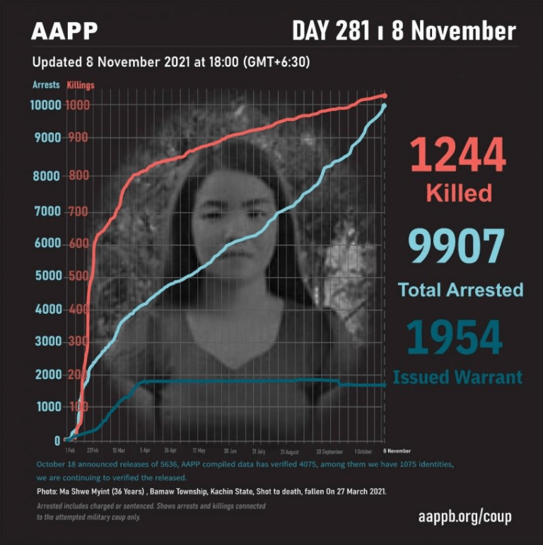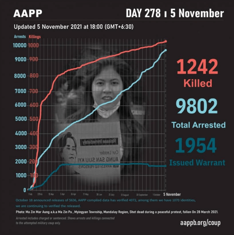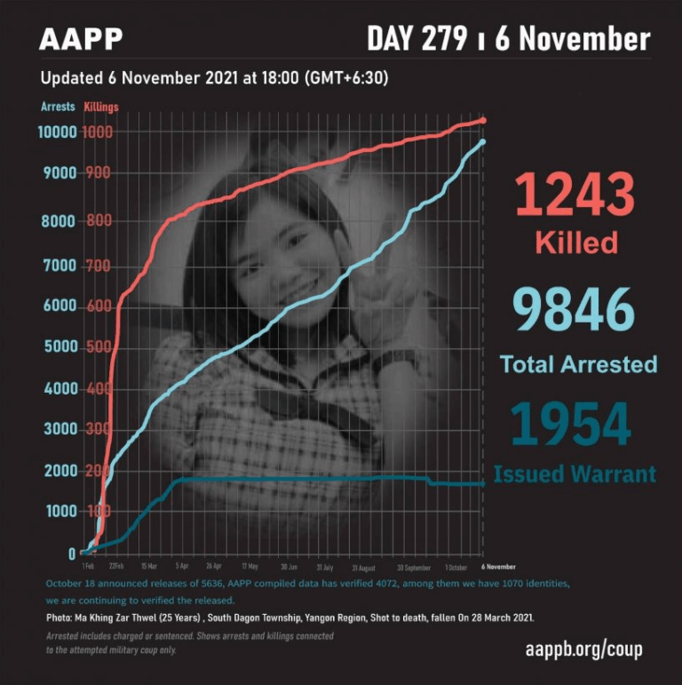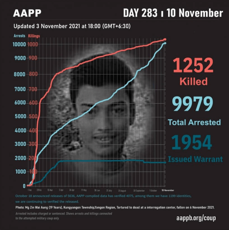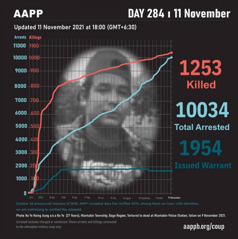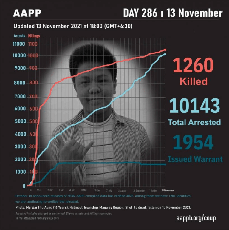 Daily Briefing in Relation to the Military Coup Updated 13 November 2021 As of November 13, (1260) people are now confirmed killed by this junta coup. AAPP compiled and documented (2) fallen heroes today. These (2) fallen heroes from Pobba…
