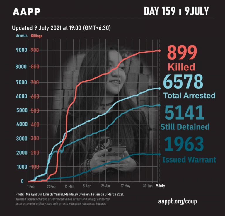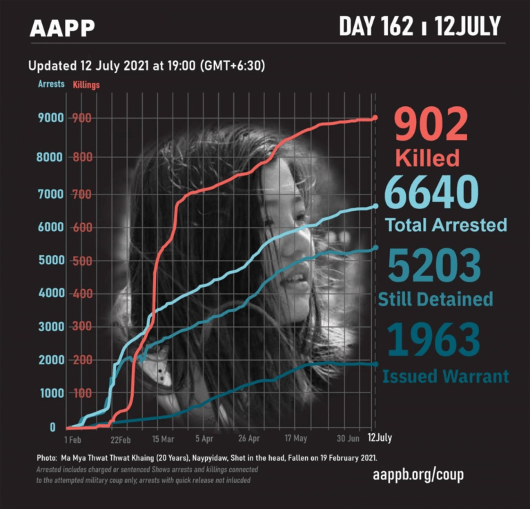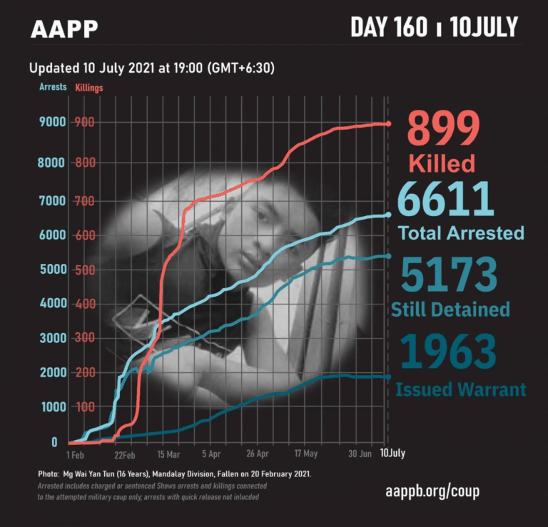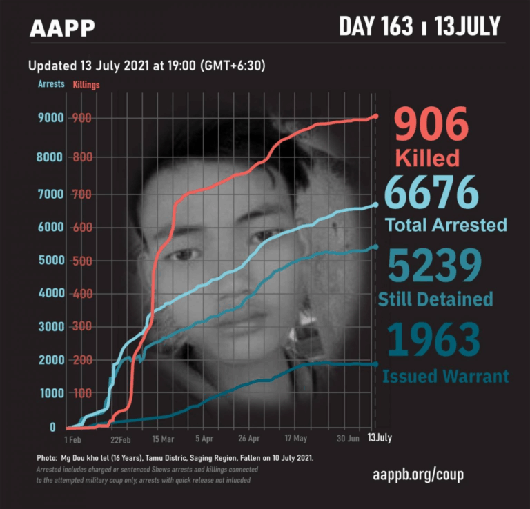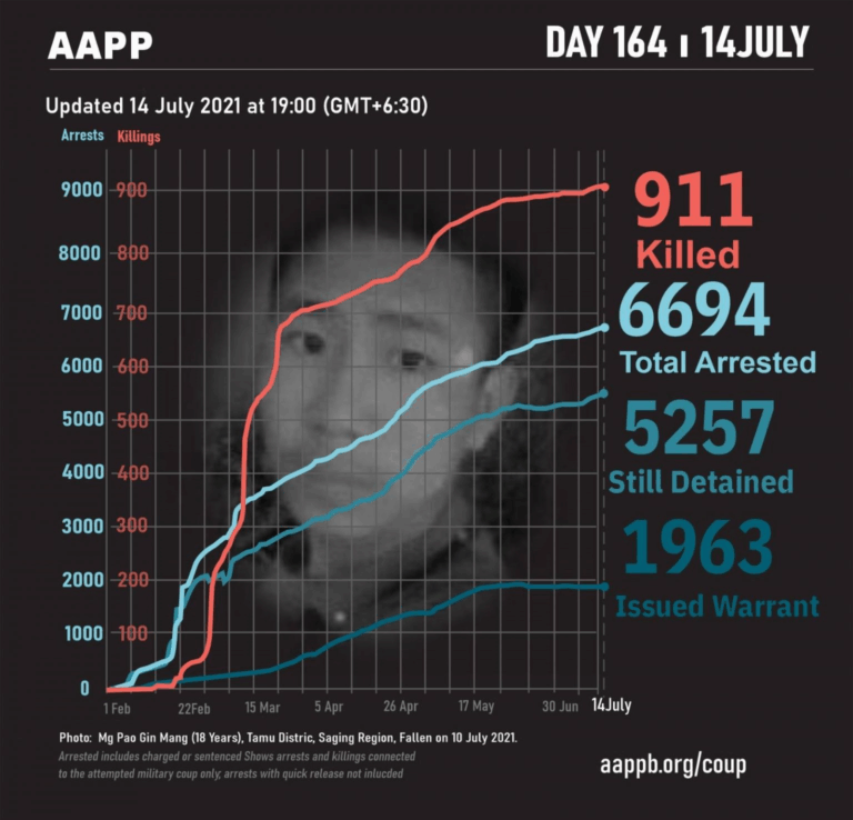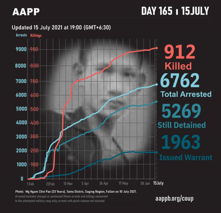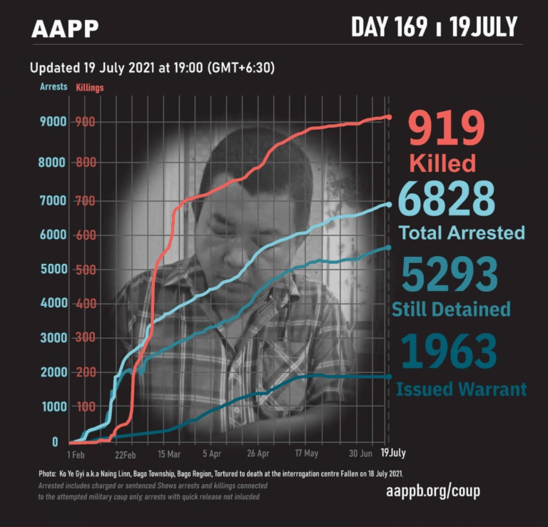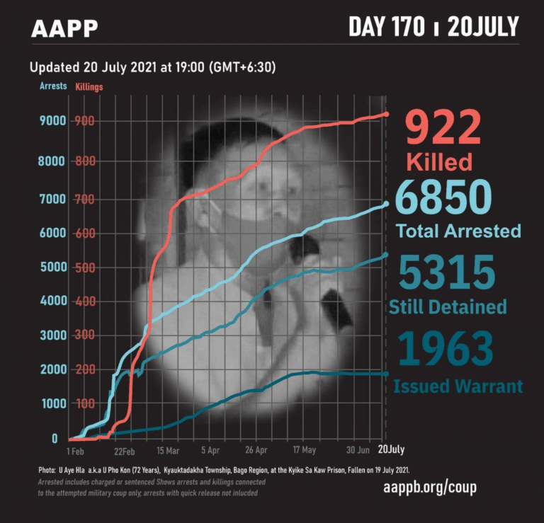 Daily Briefing in Relation to the Military Coup Updated 20 July 2021 As of 20 July, (922) people are now confirmed killed by this junta coup. AAPP compiled and documented (3) fallen heroes today. These (3) fallen heroes from Sanchaung…