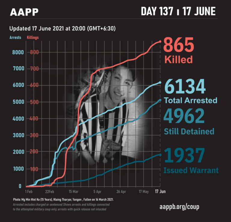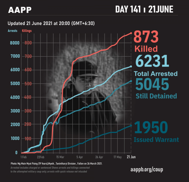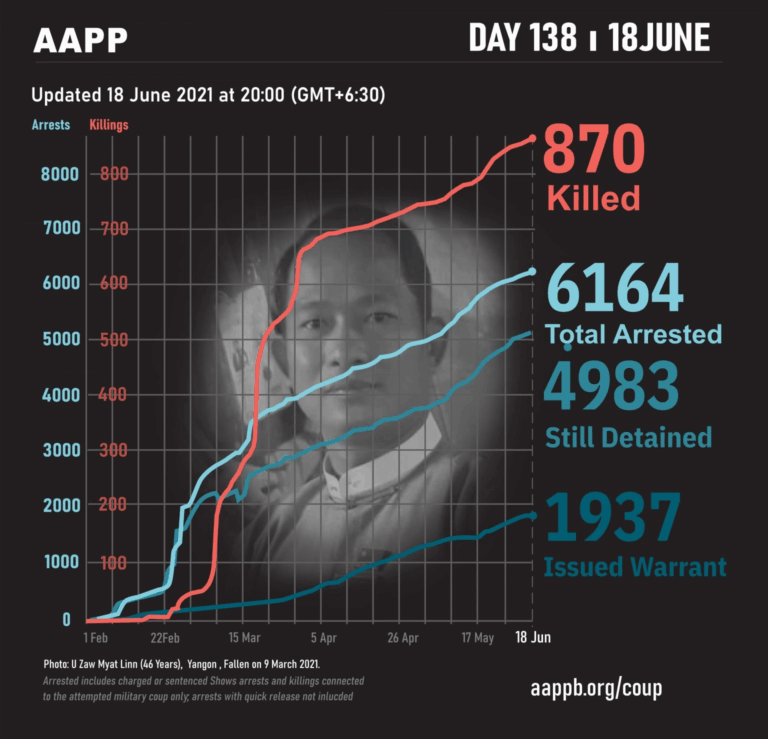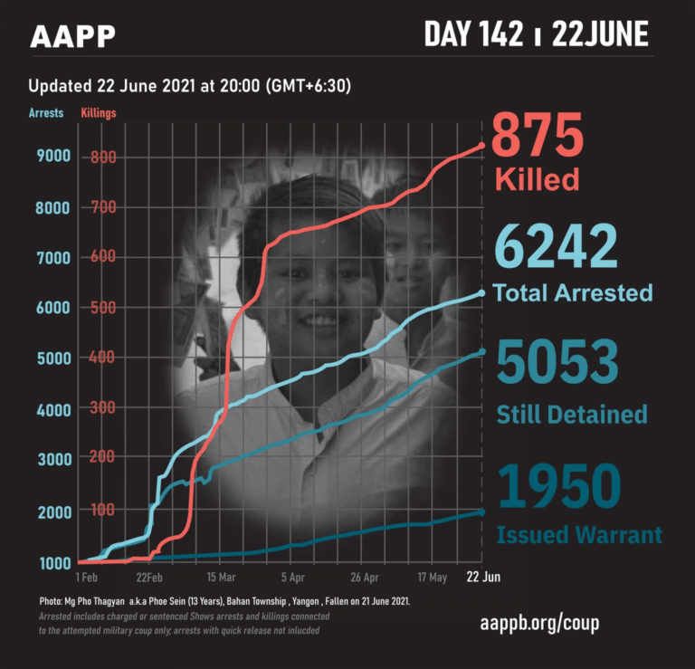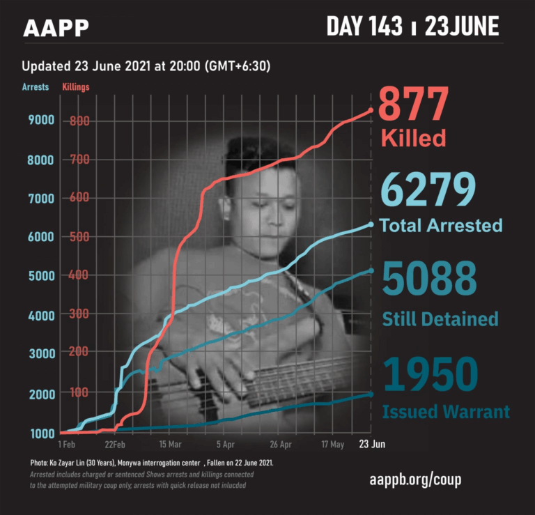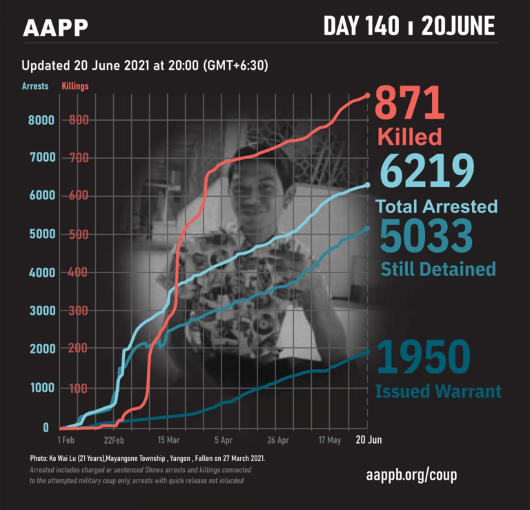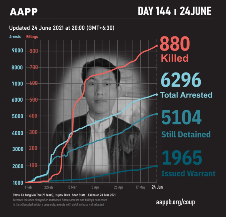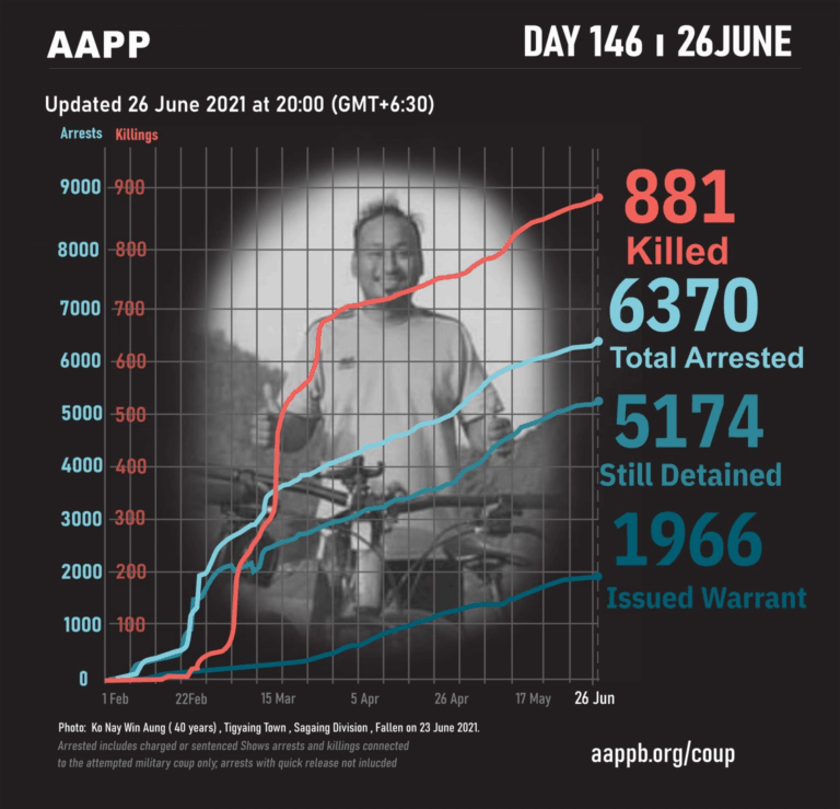 Daily Briefing in Relation to the Military Coup Updated 27 June 2021 As of 27 June, (883) people are now confirmed killed by this junta coup. AAPP compiled and documented (2) fallen heroes today. These (2) fallen heroes from Kale…