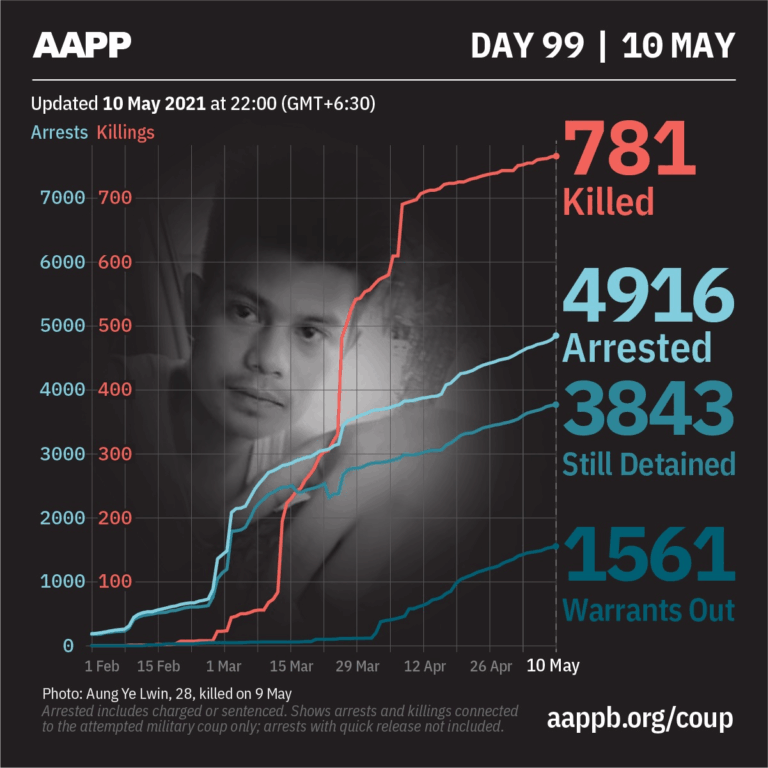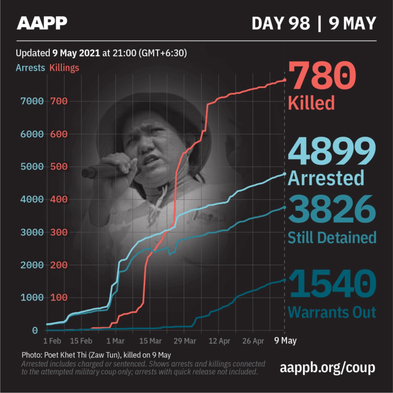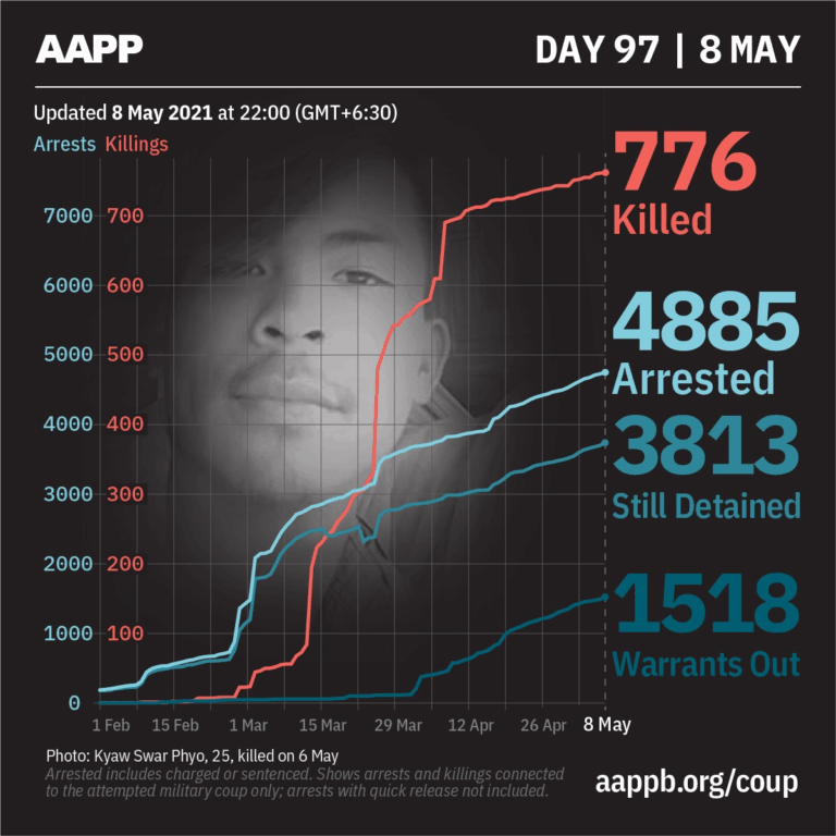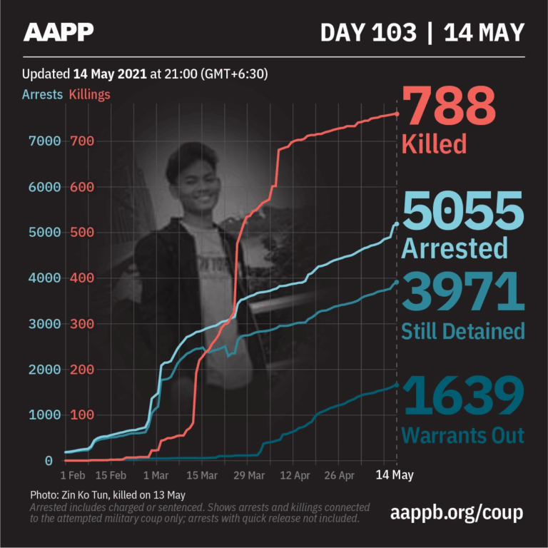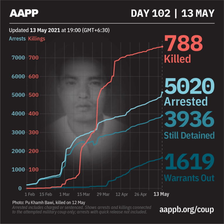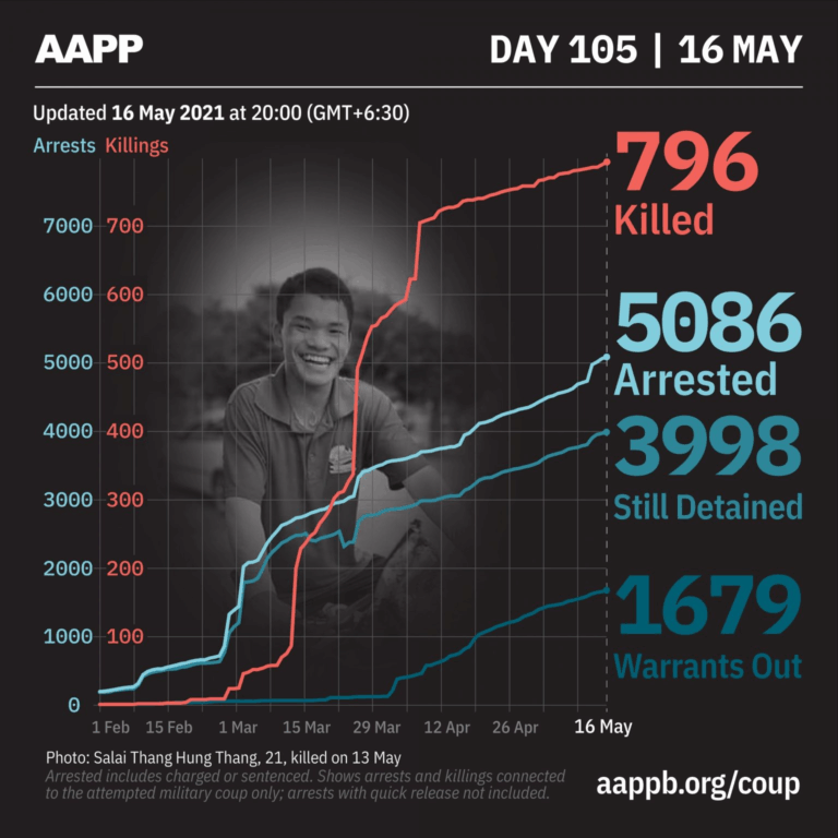 Daily Briefing in Relation to the Military Coup Updated 17 May 2021 As of 17 May, (802) people are now confirmed killed by this junta coup. AAPP compiled and documented (6) fallen heroes today. These (6) fallen heroes from Mindat,…