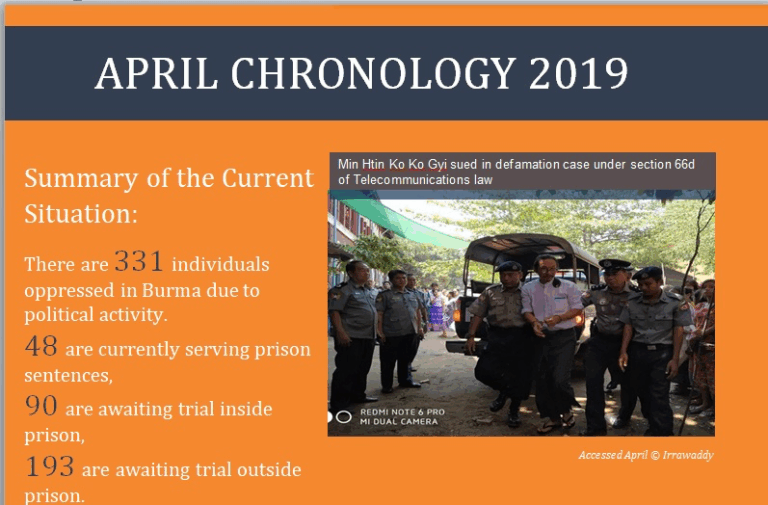 MONTH IN REVIEW April Month in Review Presidential Pardon For Burmese New Year, on April 17 and April 26, 9535 and 6948 local prisoners from different prisons were released under the order of the presidential pardon. However, only five political…