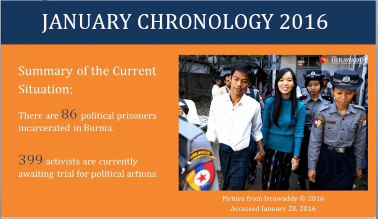 Summary of the Current Situation:There are 110 political prisoners incarcerated in Burma.428 activists are currently awaiting trial for political actions, 130 of whom are incarcerated.Month In ReviewThis month, 9 political activists were arrested in total, 30 individuals were sentenced and…