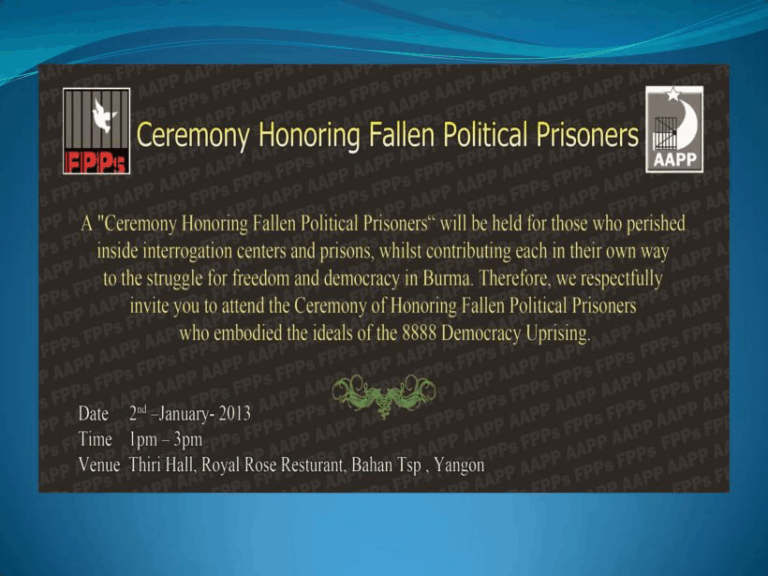 ႏိုင္ငံေရးအက်ဥ္းသားမ်ားကူညီေစာင့္ေရွာက္ေရးအသင္း (ေအေအပီပီ) ႏွင့္ ႏို္င္ငံေရးအက်ဥ္းသားေဟာင္းမ်ားအဖြဲ႕တို႔ မွစီစဥ္က်င္းပခဲ့ေသာ က်ဆုံးႏိုင္ငံေရးအက်ဥ္းသားမ်ား ဂုဏ္ျပဳပြဲသို႔ အမ်ိဳးသားဒီမိုကေရစီအဖြဲ႕ခ်ဳပ္ ဥကၠဌ ေဒၚေအာင္ဆန္းစုၾကည္မွ ေပးပို႔ခဲ့ေသာ သဝဏ္လႊာျဖစ္ပါတယ္။