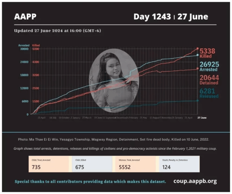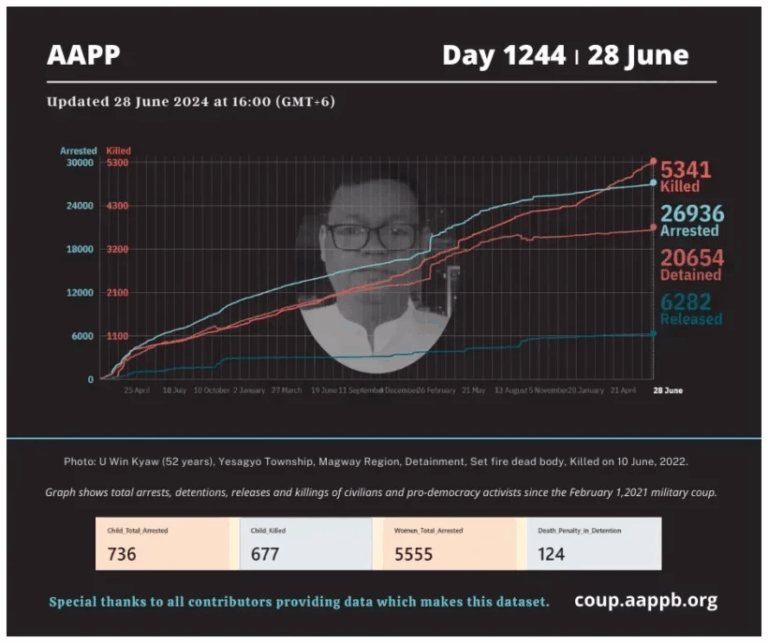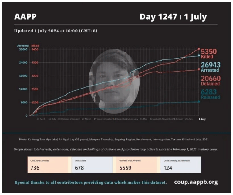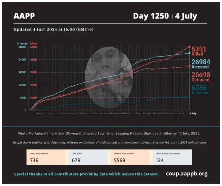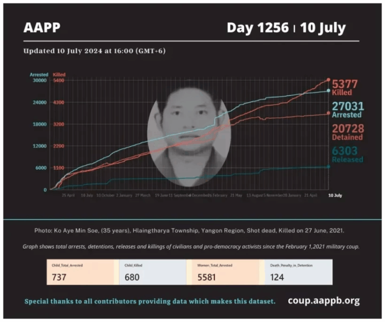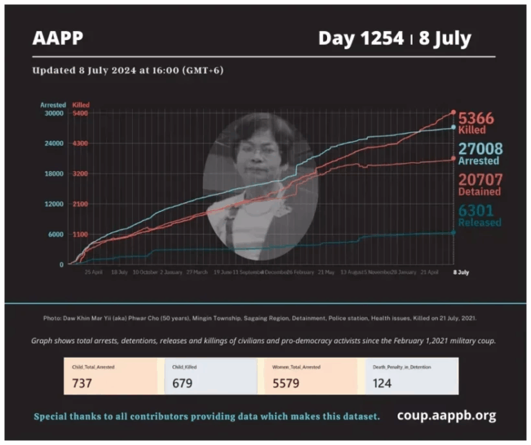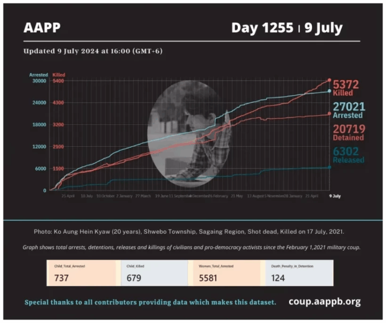Daily Briefing in Relation to the Military Coup Date – 10 July 2024 Since the 1 February 2021 coup, a total of (5,377) people, including pro-democracy activists and civilians, have been killed by the junta and pro-military groups during the…