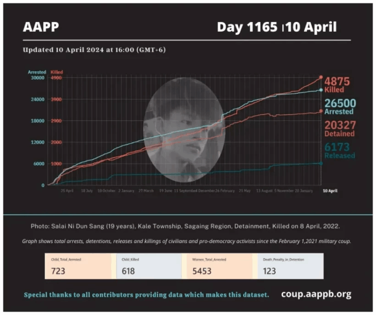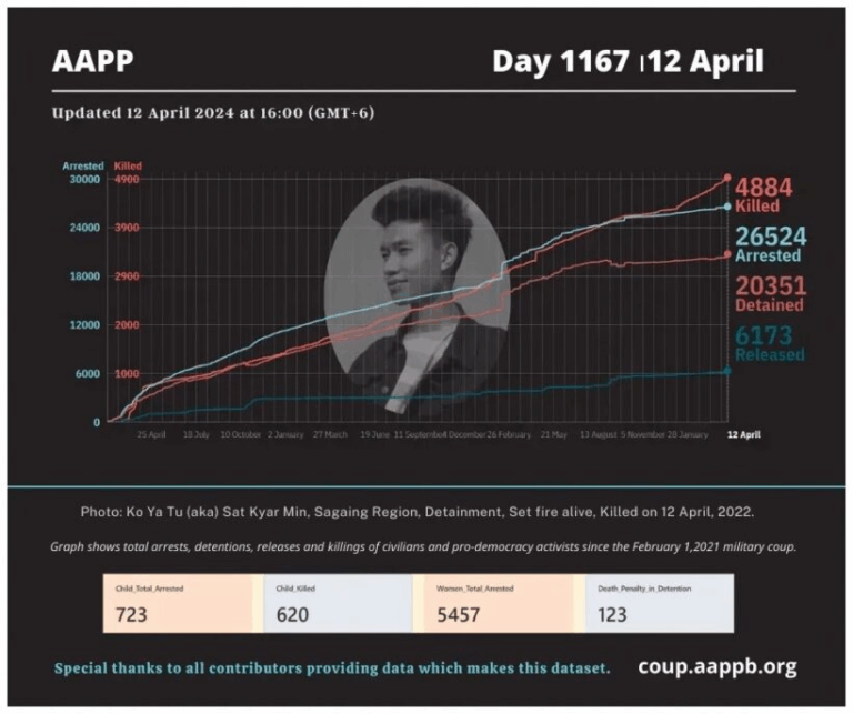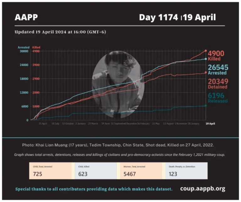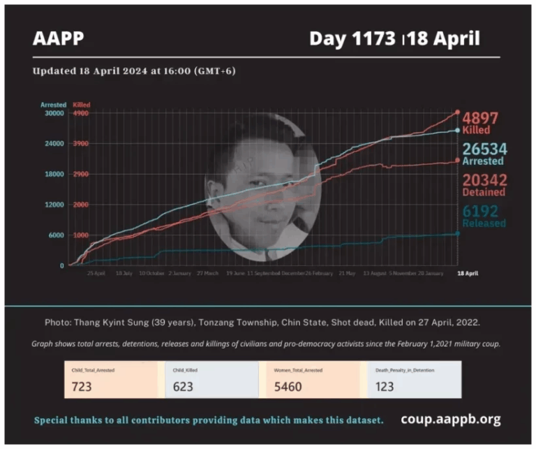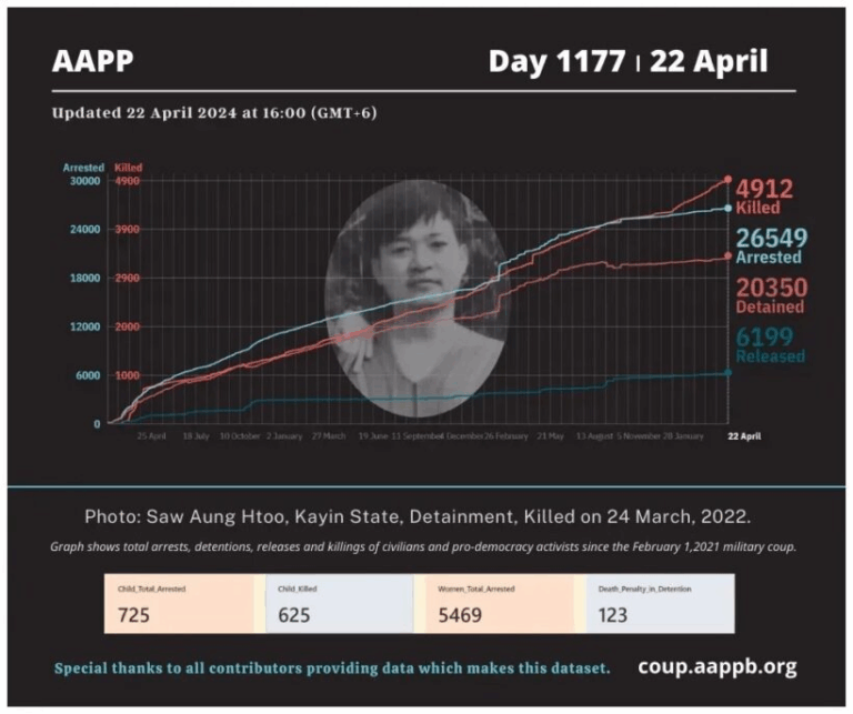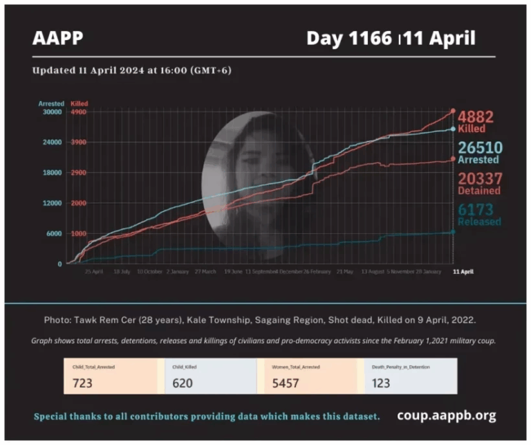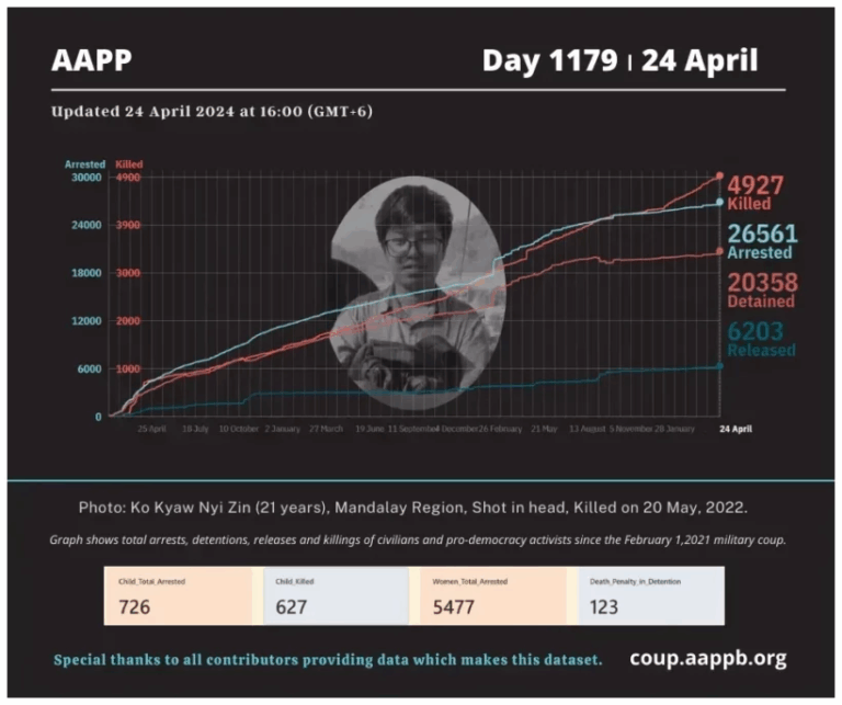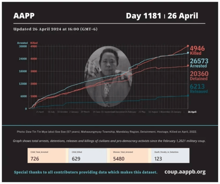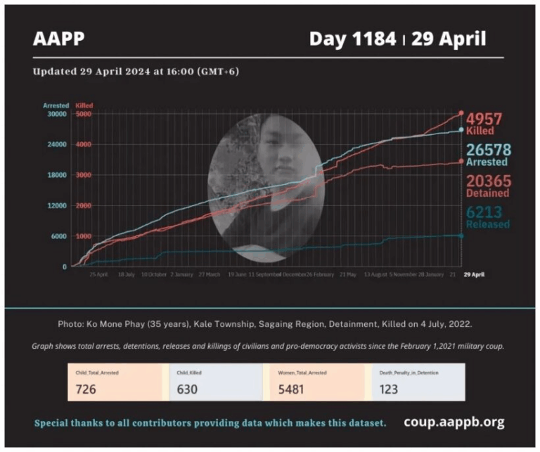 Daily Briefing in Relation to the Military Coup Date – 29 April 2024 Since the 1 February 2021 coup, a total of (4,957) people, including pro-democracy activists and civilians have been killed by the junta and pro-military groups during the…