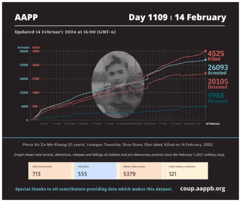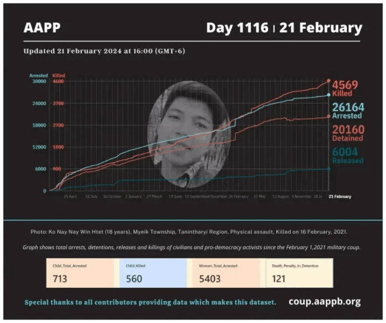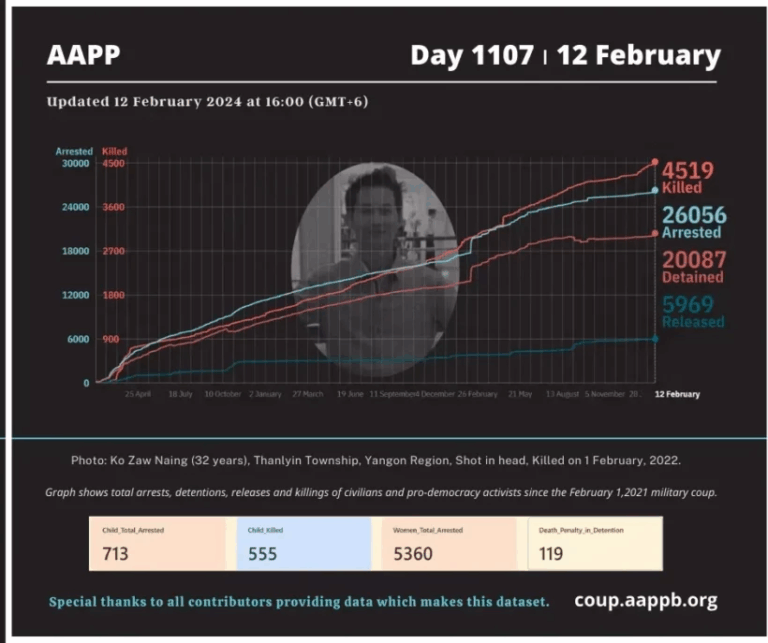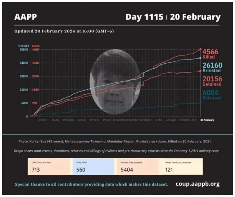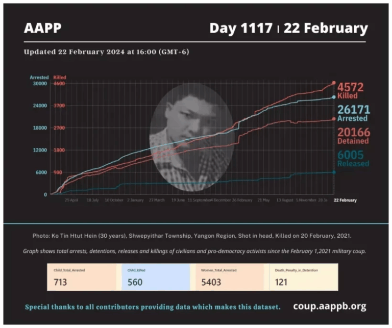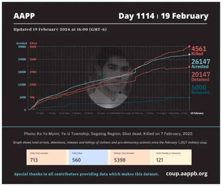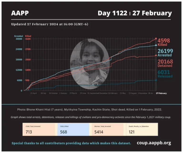 Daily Briefing in Relation to the Military Coup Date – 27 February 2024 Since the 1 February 2021 coup, a total of (4,598) people, including pro-democracy activists and civilians have been killed by the junta and pro-military groups during the…