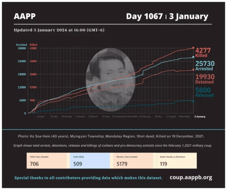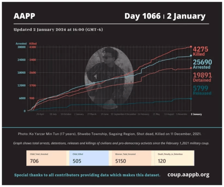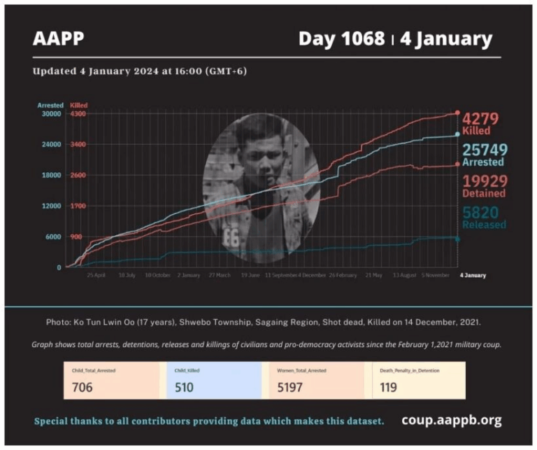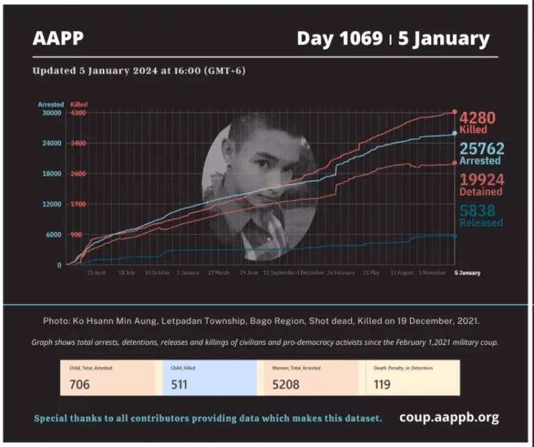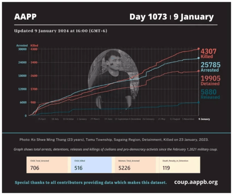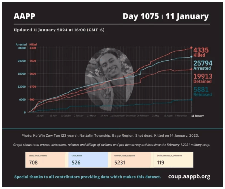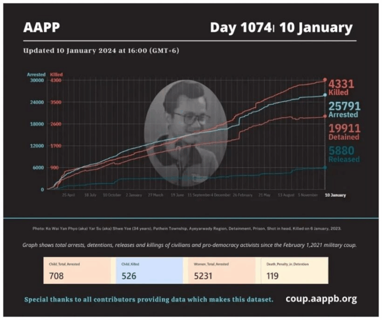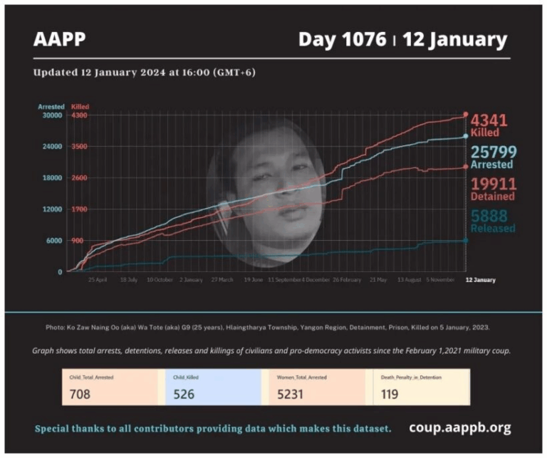 Daily Briefing in Relation to the Military Coup Date – 12 January 2024 Since the 1 February 2021 coup, a total of (4,341) people, including pro-democracy activists and civilians have been killed by the junta and pro-military groups during the…