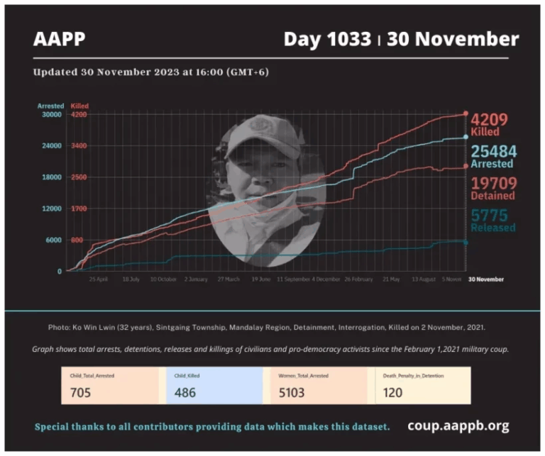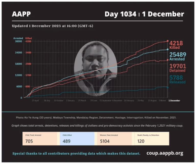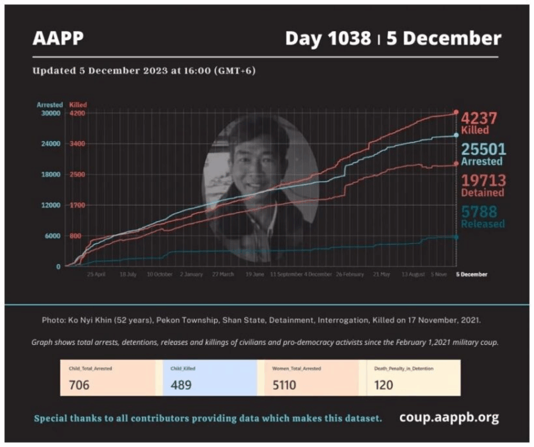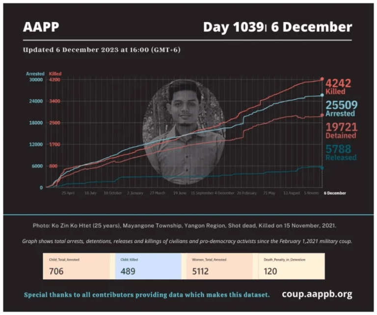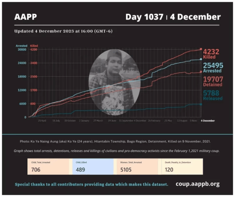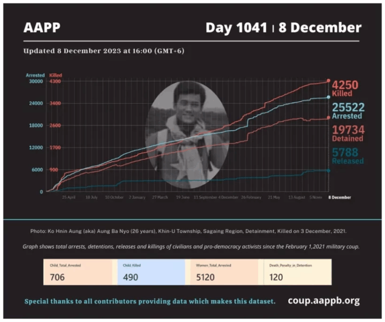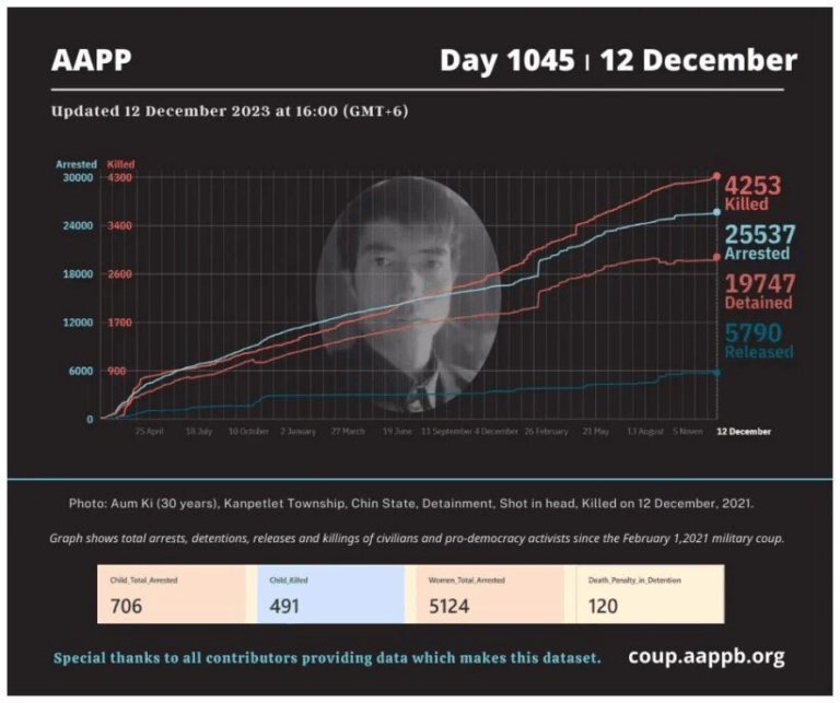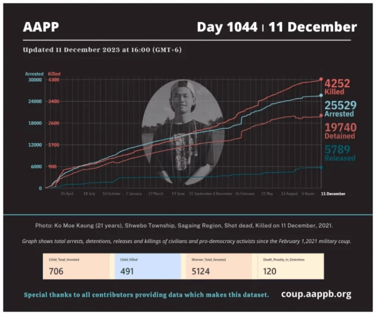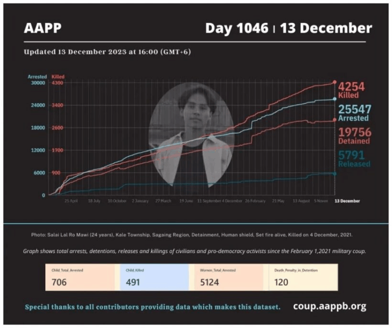 Daily Briefing in Relation to the Military Coup Updated 13 December 2023 Since the February 1, 2021 coup, a total of (4,254) people, including pro-democracy activists and civilians have been killed by the junta and pro-military groups during the Spring…