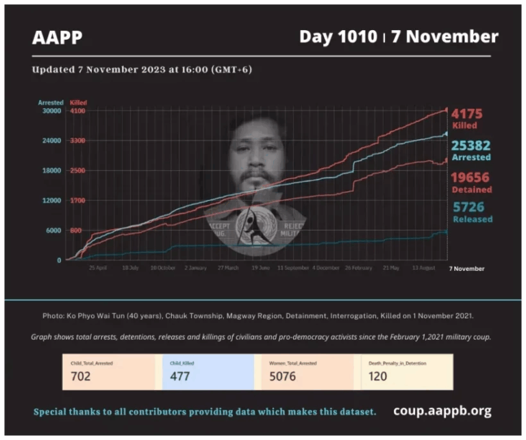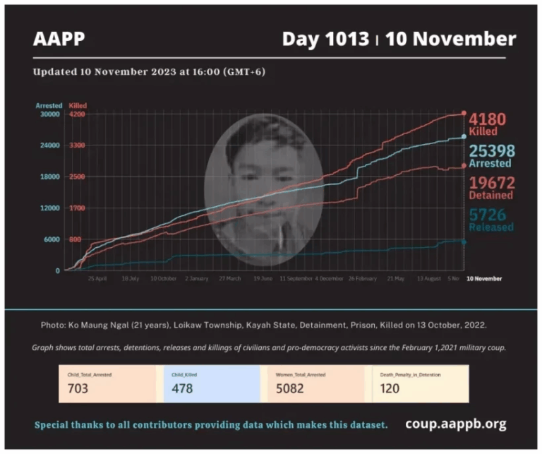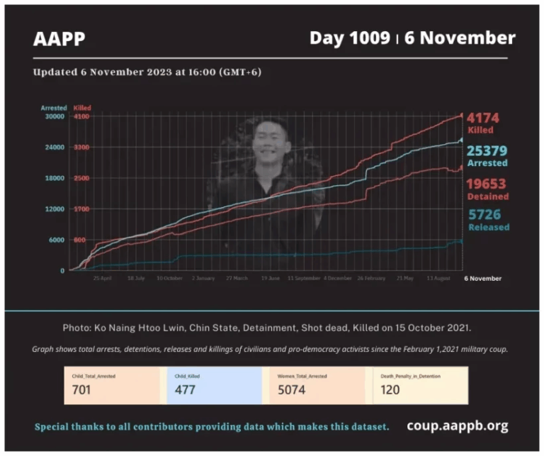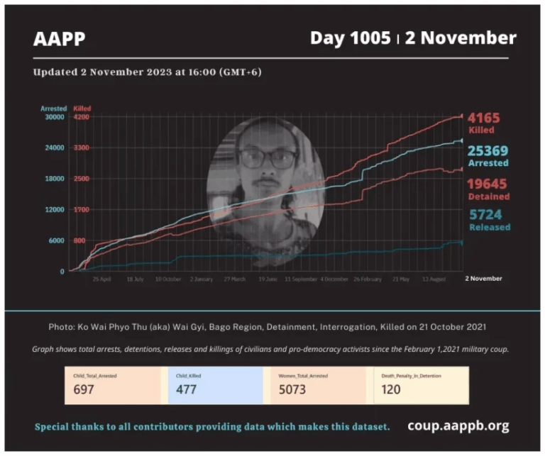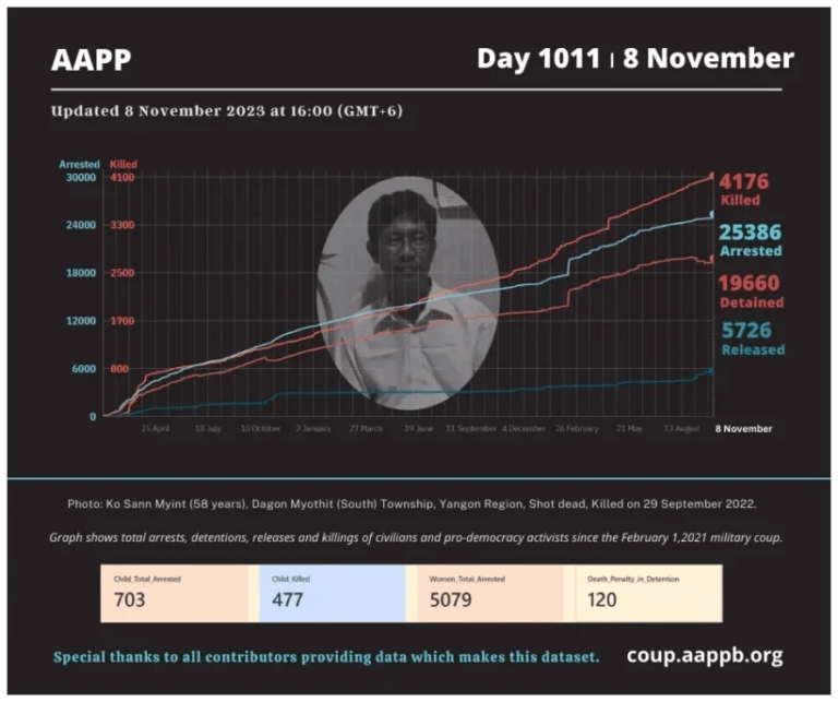 Daily Briefing in Relation to the Military Coup Updated 15 November 2023 Since the February 1, 2021 coup, a total of (4,185) people, including pro-democracy activists and civilians have been killed by the junta and pro-military groups during the Spring…