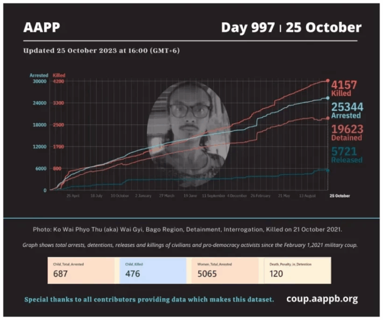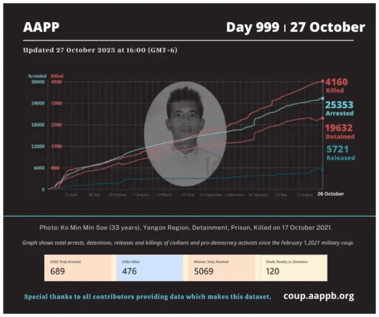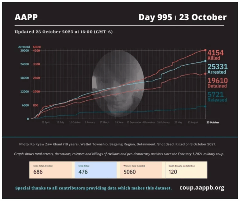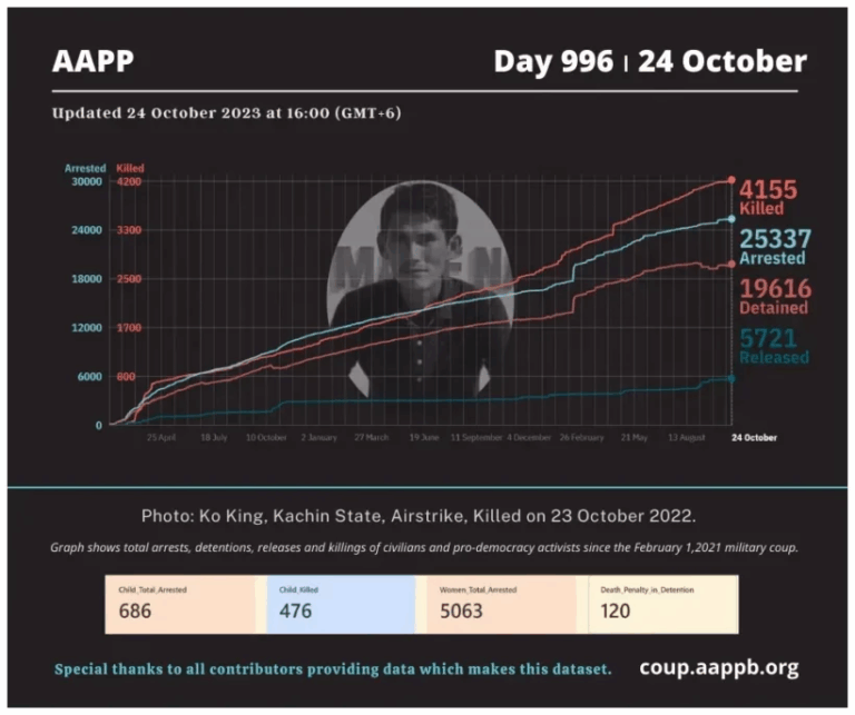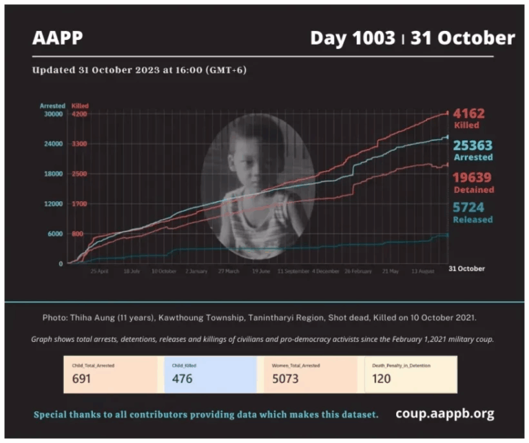 Daily Briefing in Relation to the Military Coup Updated 1 November 2023 Since the February 1, 2021 coup, a total of (4,163) people, including pro-democracy activists and civilians have been killed by the junta and pro-military groups during the Spring…