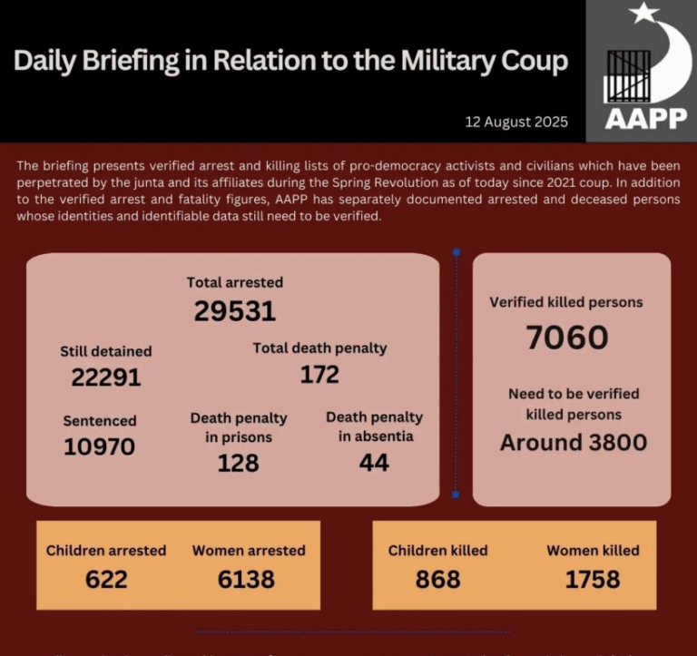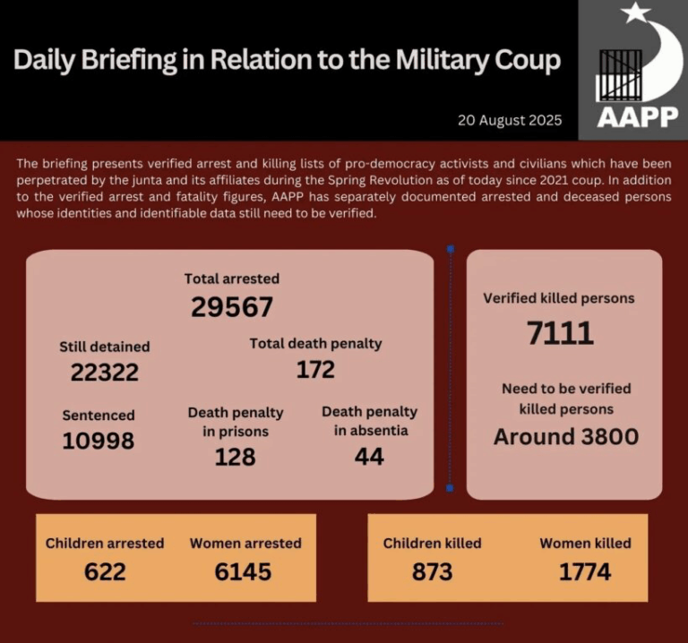 Daily Briefing in Relation to the Military Coup Date – 20 August 2025 Since the 1 February 2021 coup, a total of (7,111) people, including pro-democracy activists and civilians, have been killed by the junta and pro-military groups during the…
