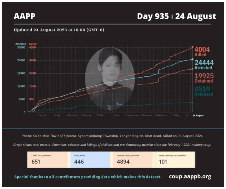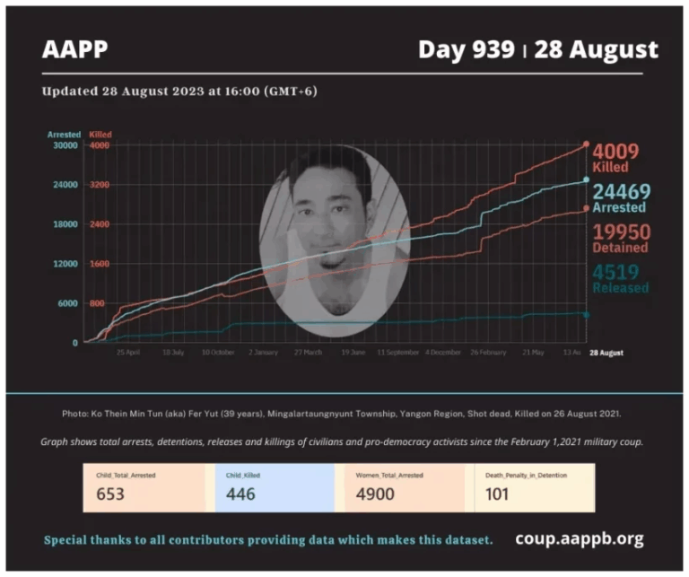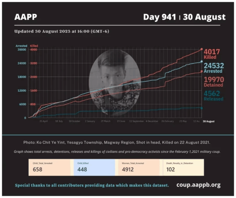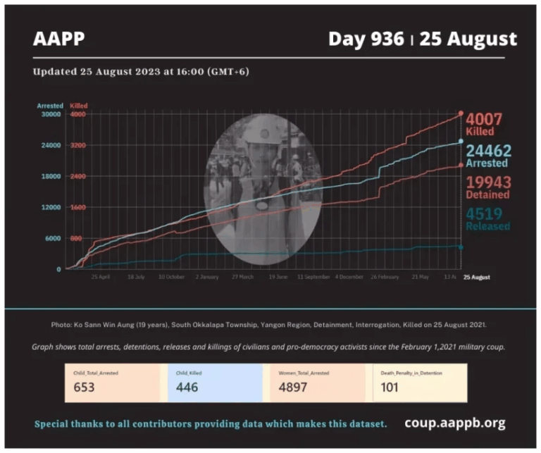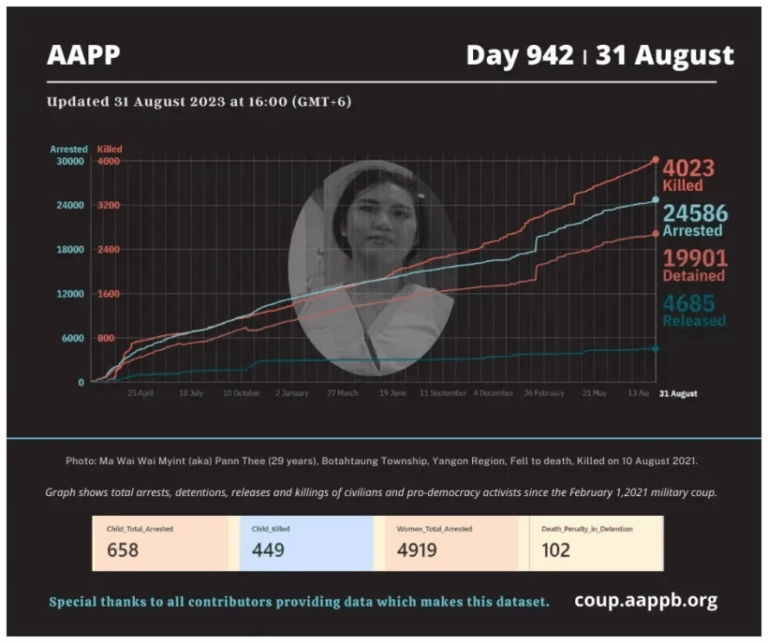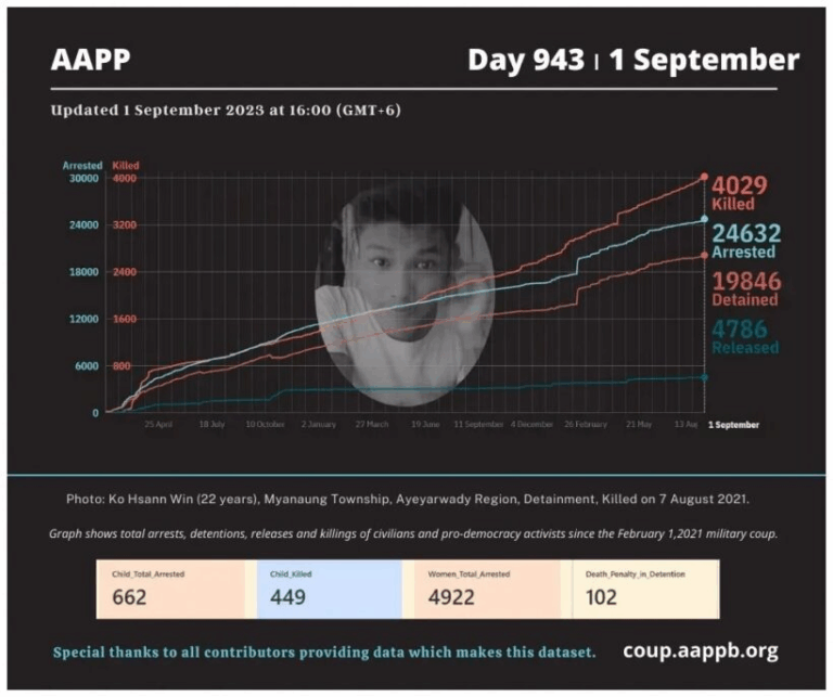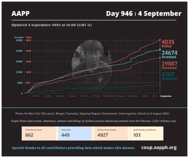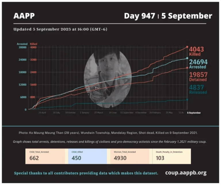 Daily Briefing in Relation to the Military Coup Updated 5 September 2023 Since the February 1, 2021 coup, a total of (4,043) people, including pro-democracy activists and civilians have been killed by the junta and pro-military groups during the Spring…