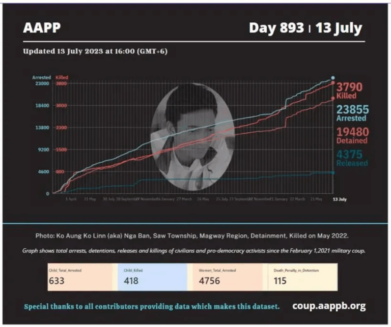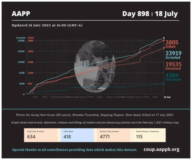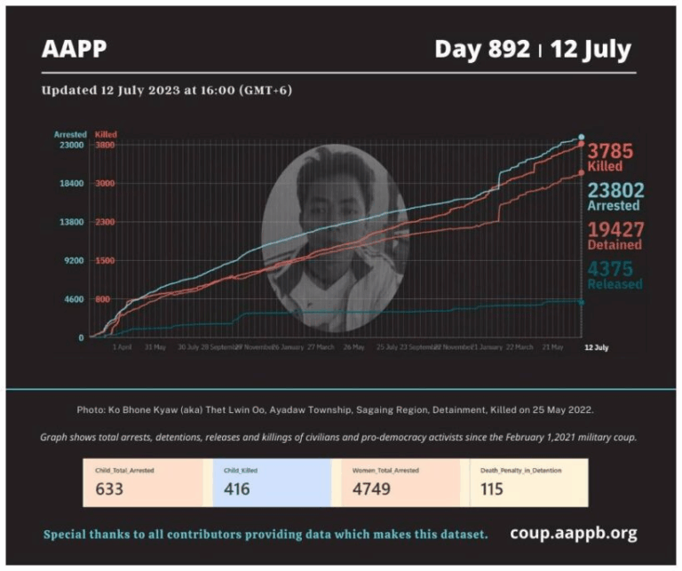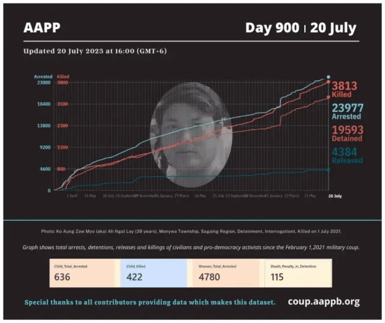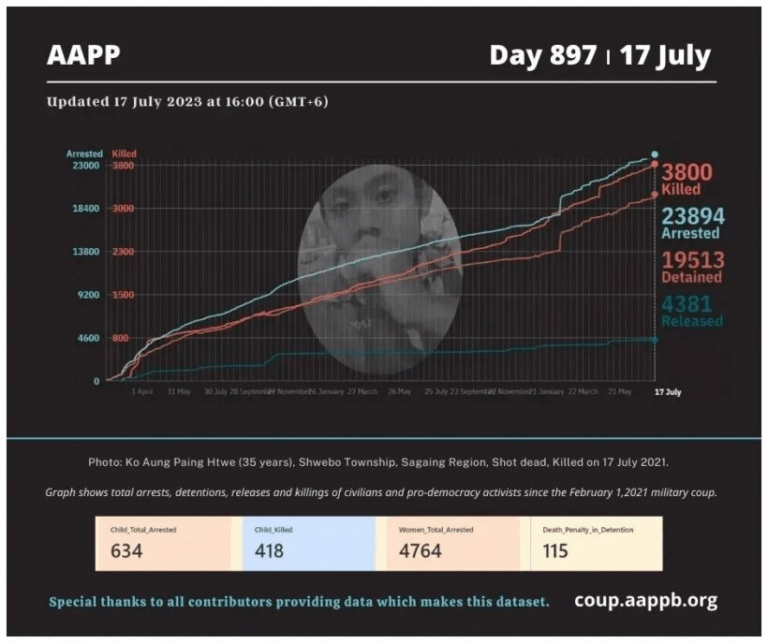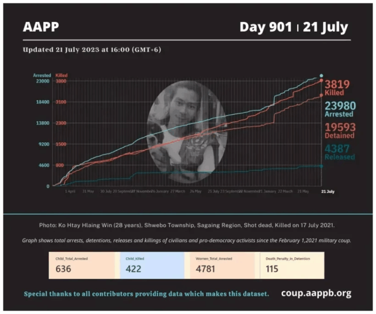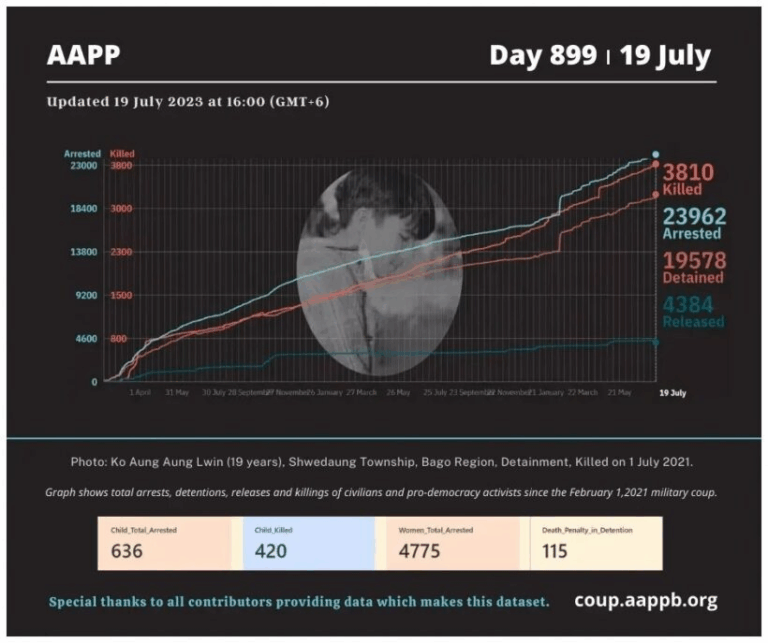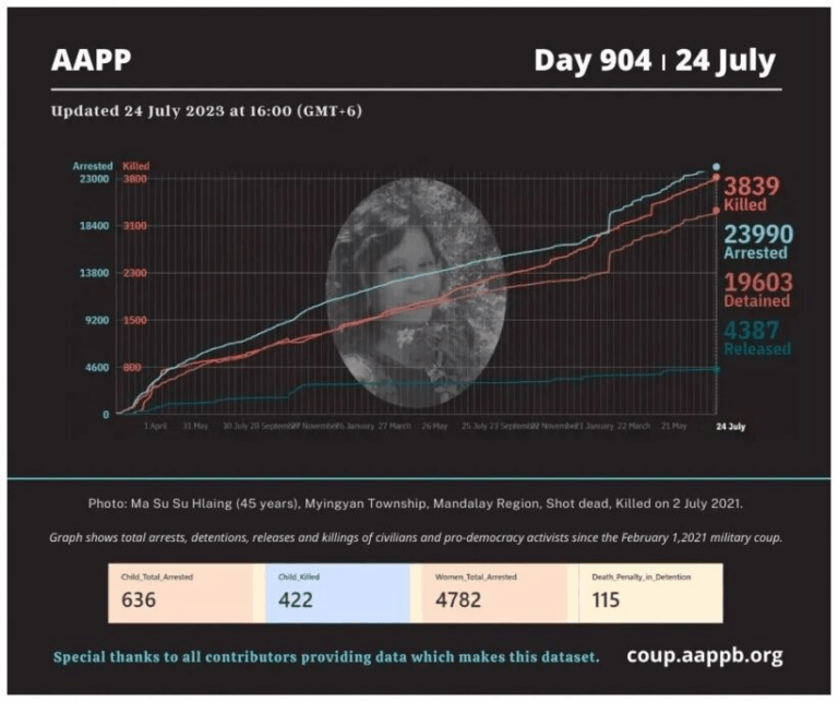Daily Briefing in Relation to the Military Coup Updated 24 July 2023 Since the February 1, 2021 coup and the emergence of the Spring Revolution, a total of (3,839) people, including pro-democracy activists and civilians have been killed through military crackdowns against…