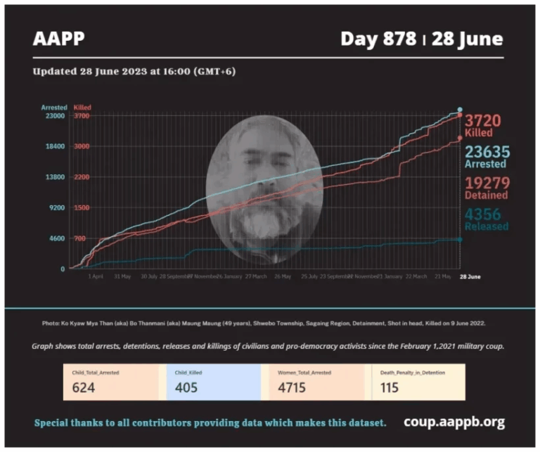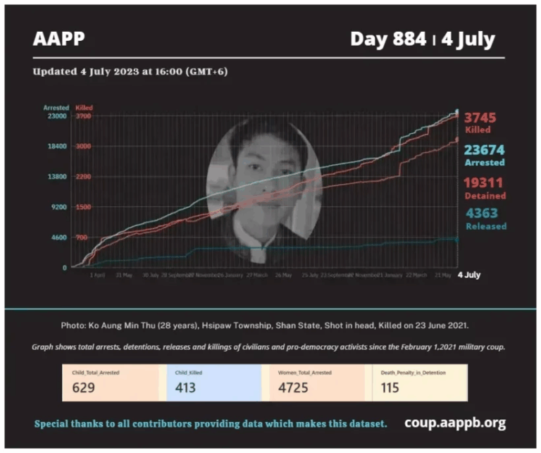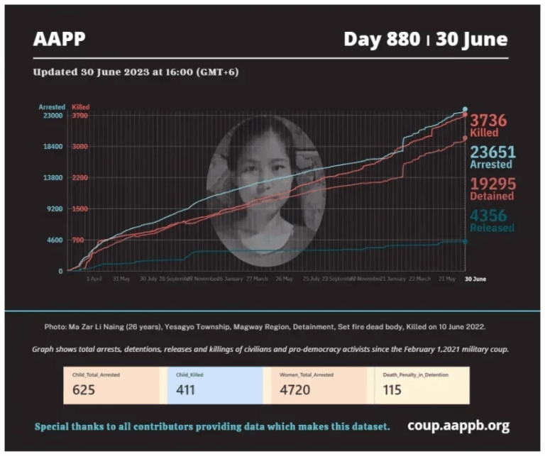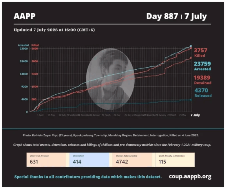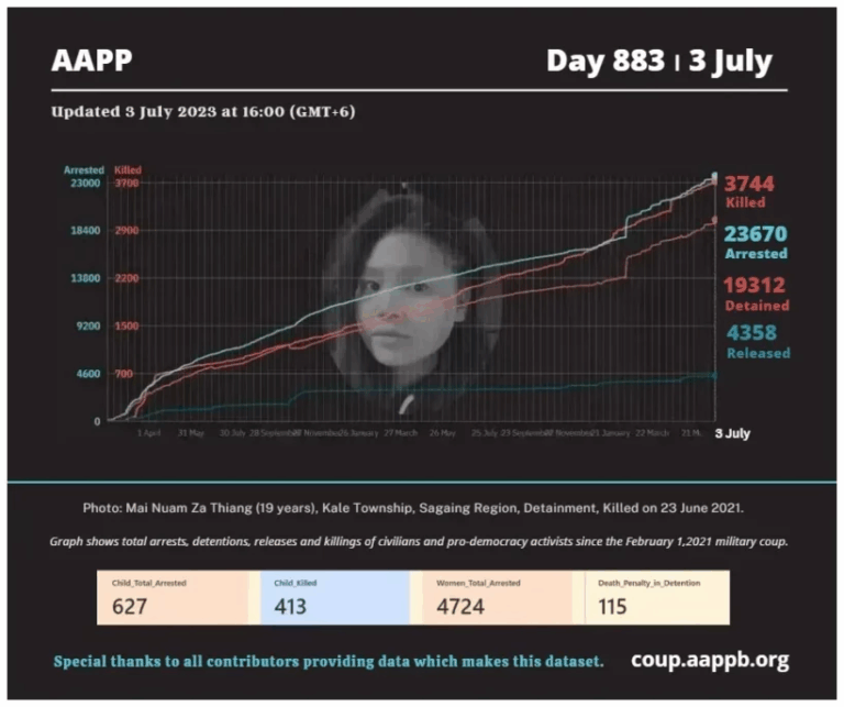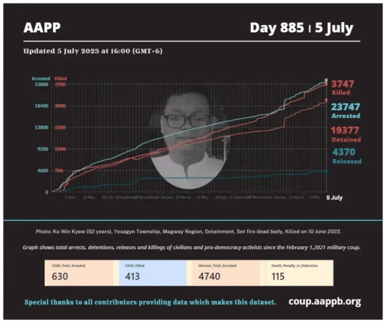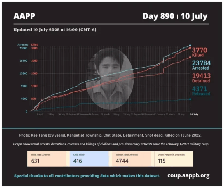 Daily Briefing in Relation to the Military Coup Updated 10 July 2023 Since the February 1, 2021 coup and the emergence of the Spring Revolution, a total of (3,770) people, including pro-democracy activists and civilians have been killed through military…