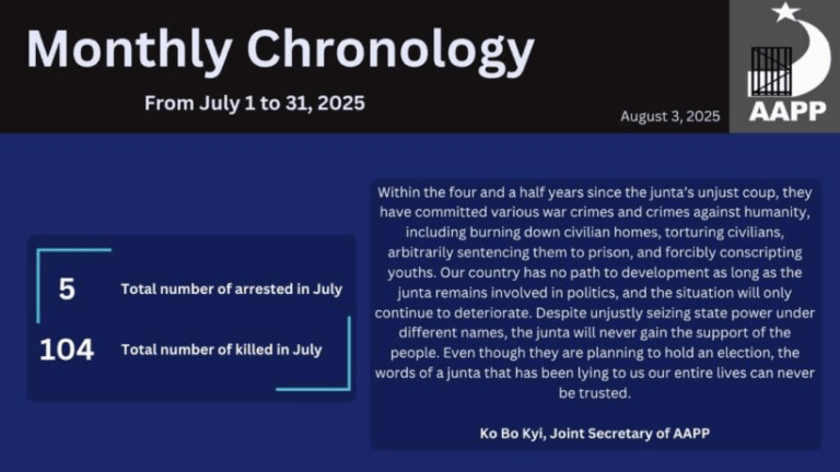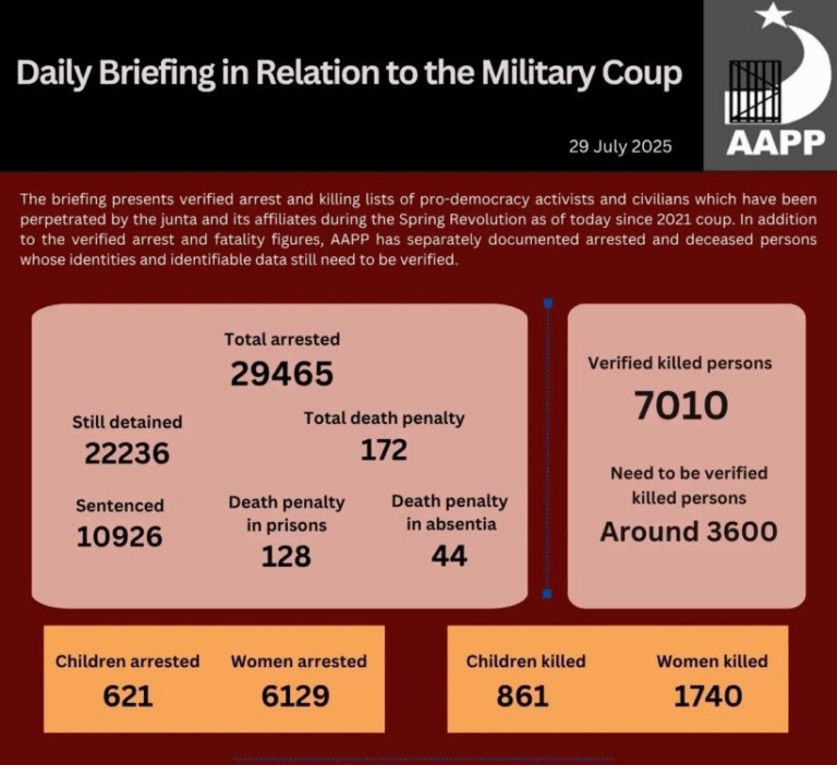 Daily Briefing in Relation to the Military Coup Date – 5 August 2025 Since the 1 February 2021 coup, a total of (7,035) people, including pro-democracy activists and civilians, have been killed by the junta and pro-military groups during the Spring Revolution. …