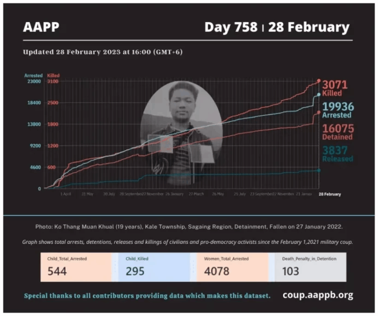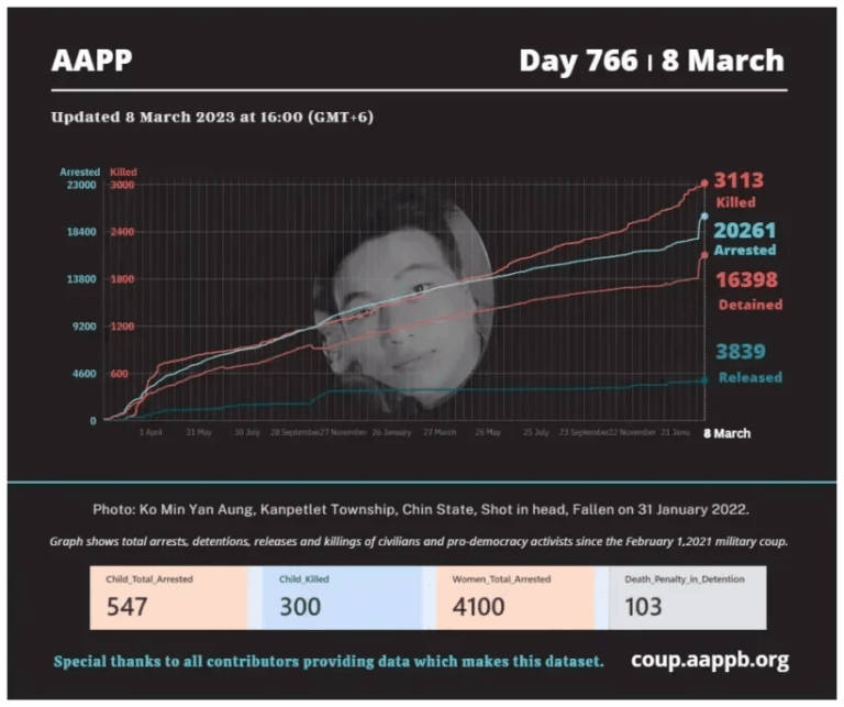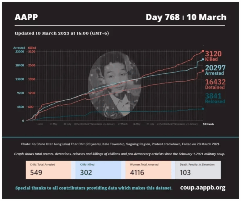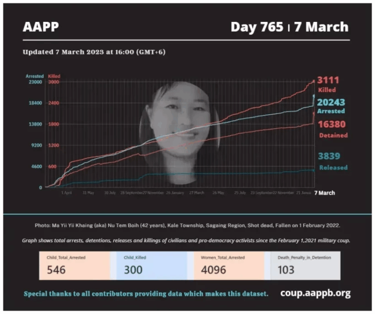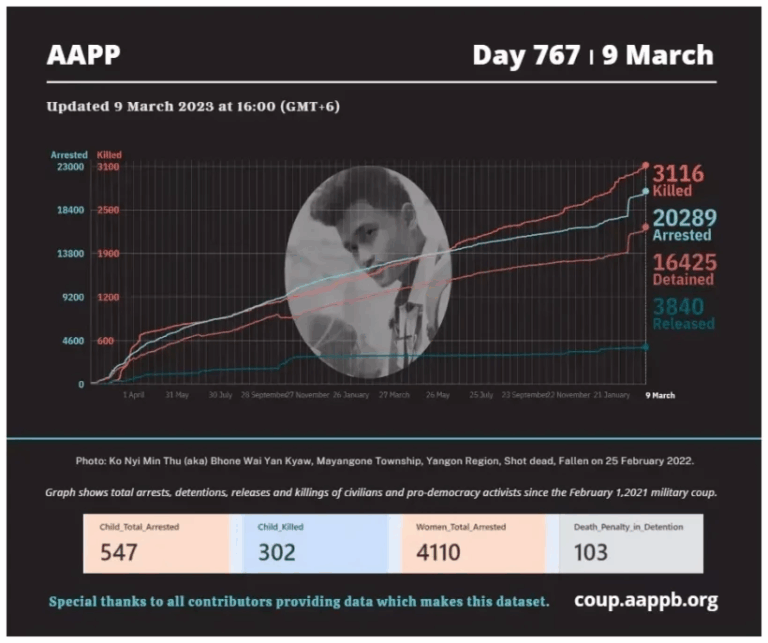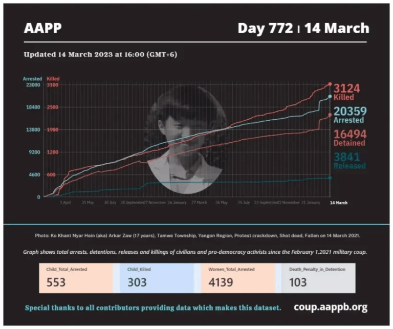 Daily Briefing in Relation to the Military Coup Updated 14 March 2023 Since the February 1, 2021, military coup and the emergence of the Spring Revolution, a total of (3,124) people, including pro-democracy activists and other civilians, have been killed through military…