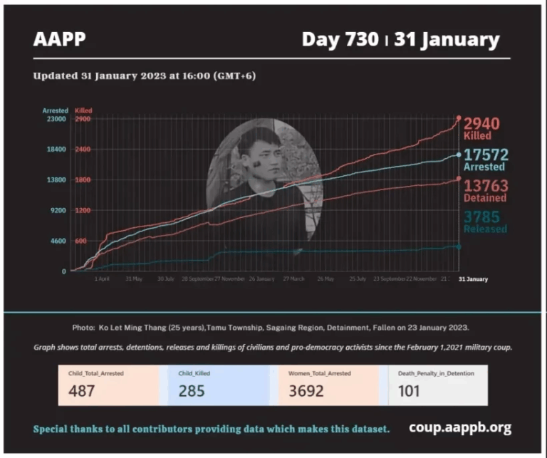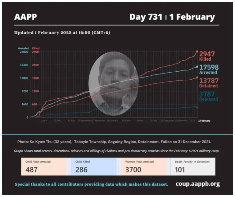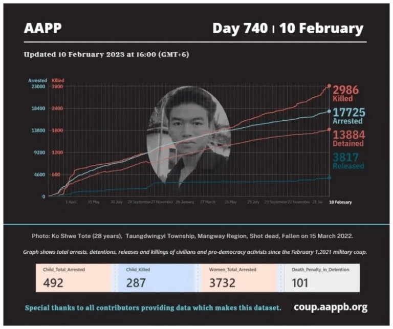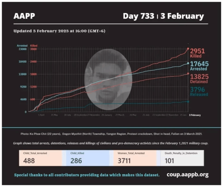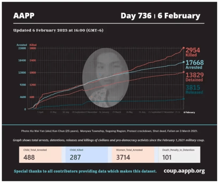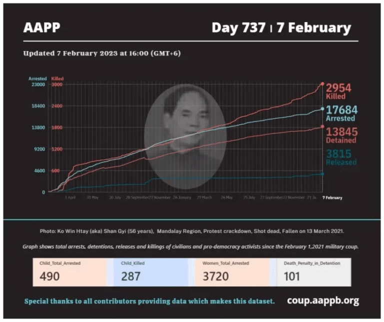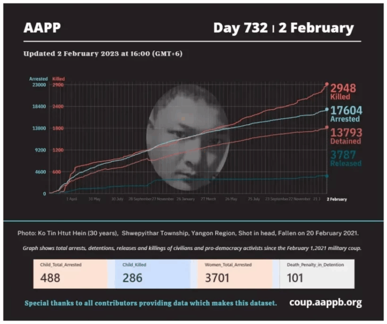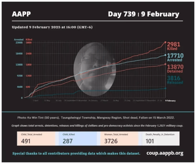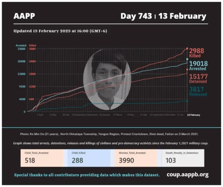 Daily Briefing in Relation to the Military Coup Updated 13 February 2023 Since the February 1, 2021, military coup and the emergence of the Spring Revolution, a total of (2,988) people, including pro-democracy activists and other civilians, have been killed through military…