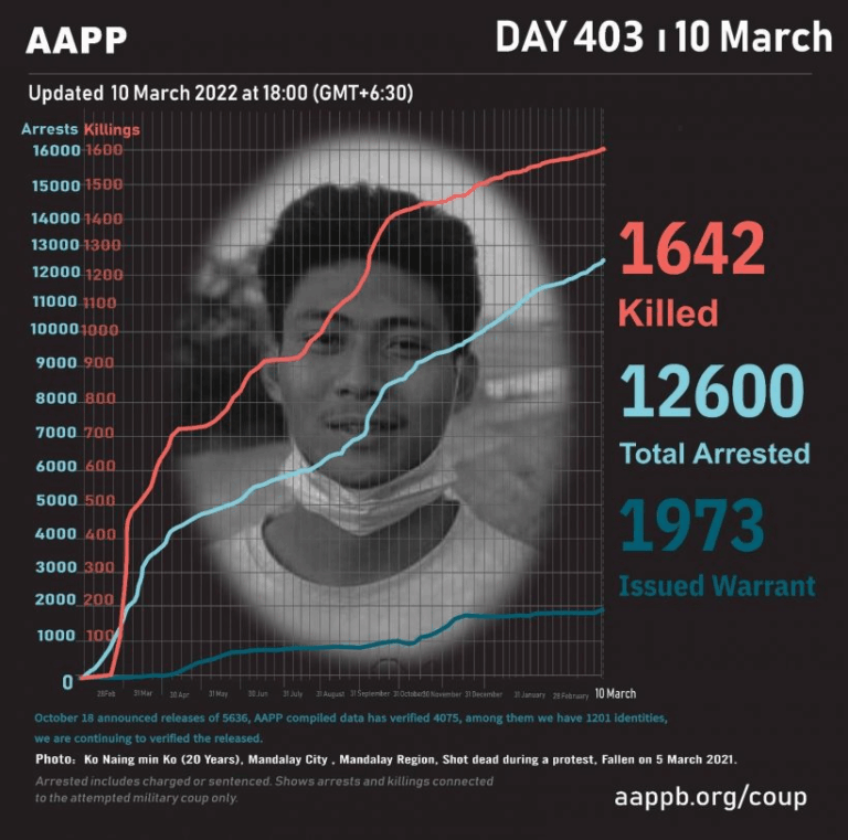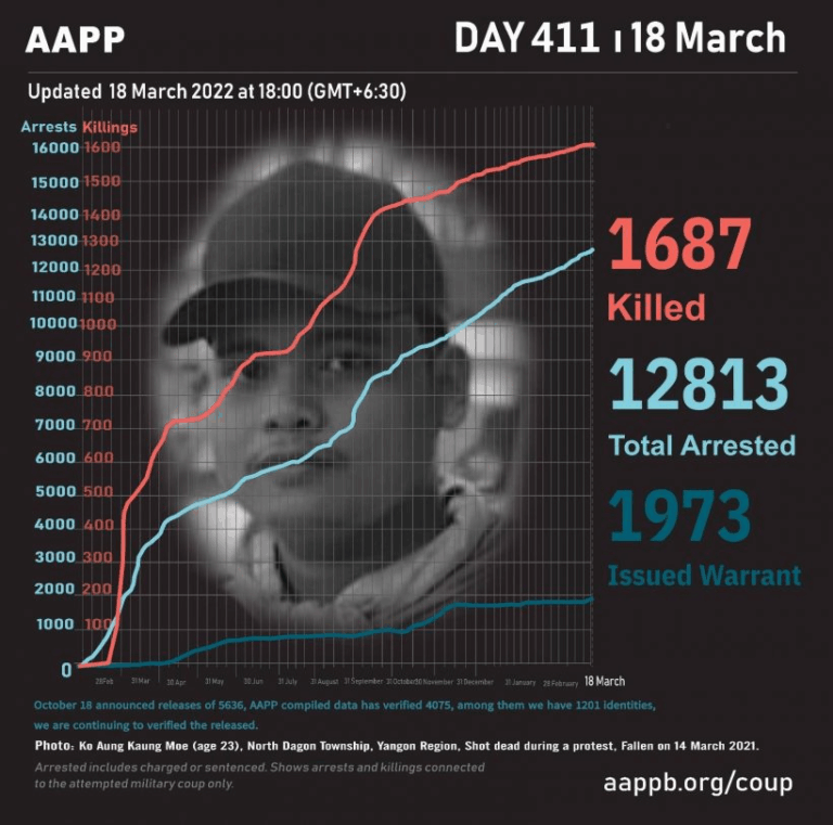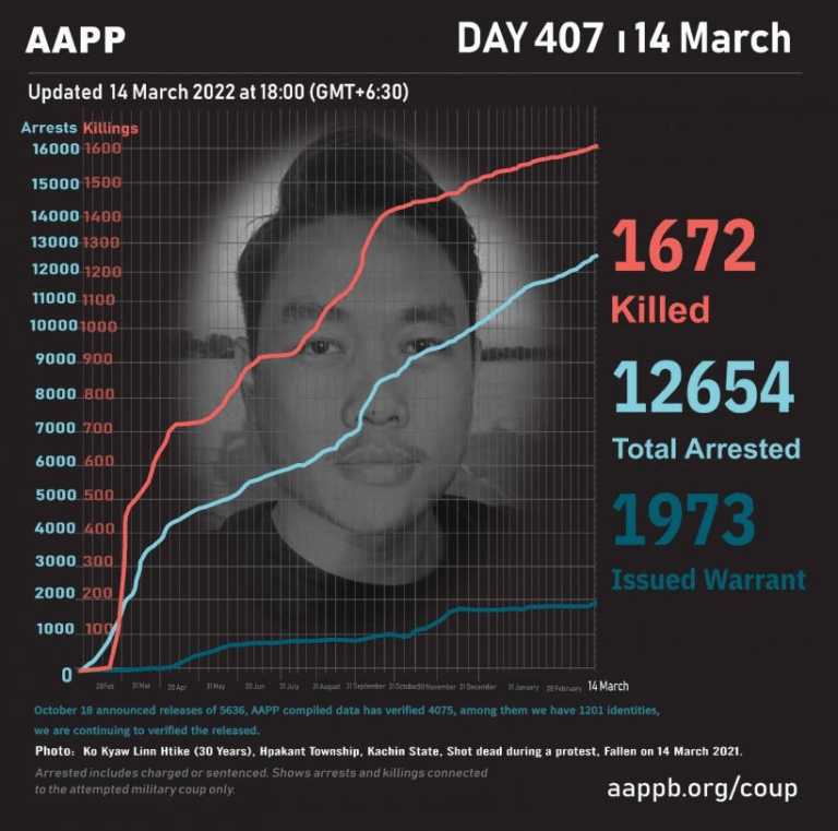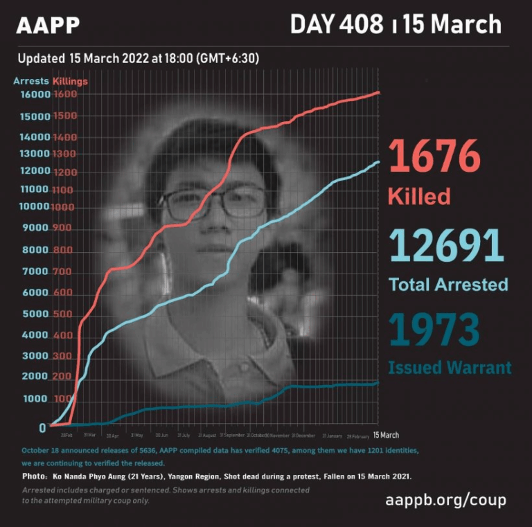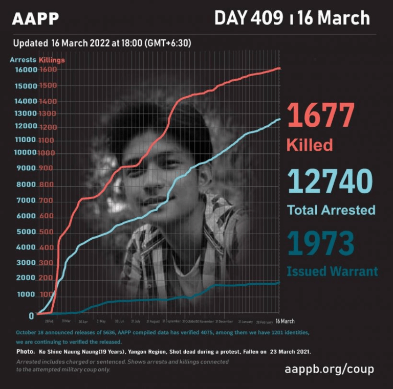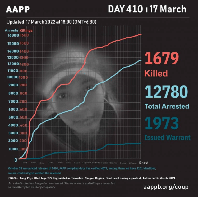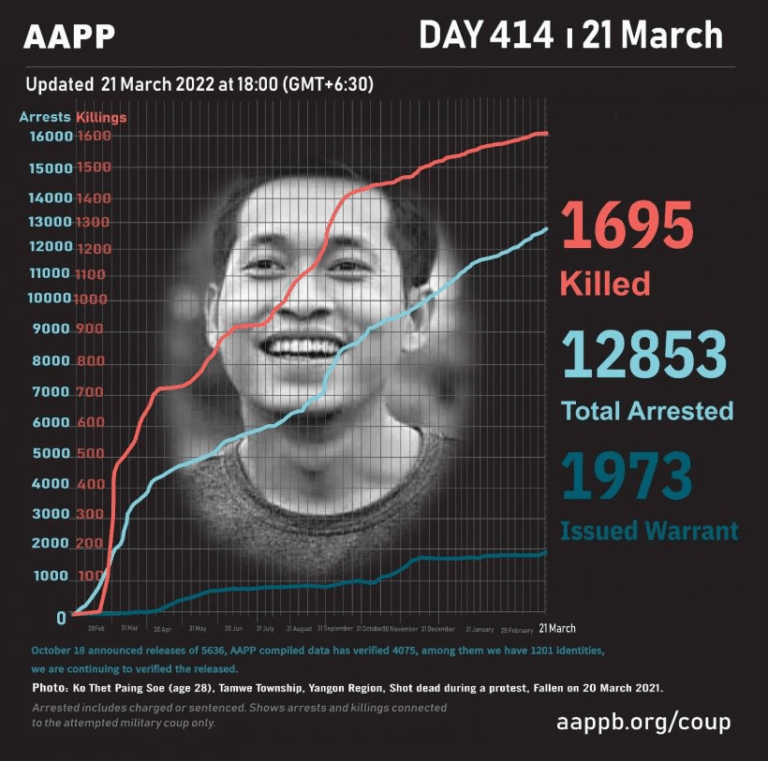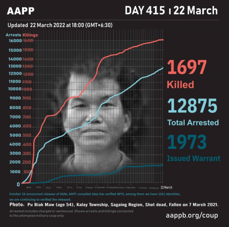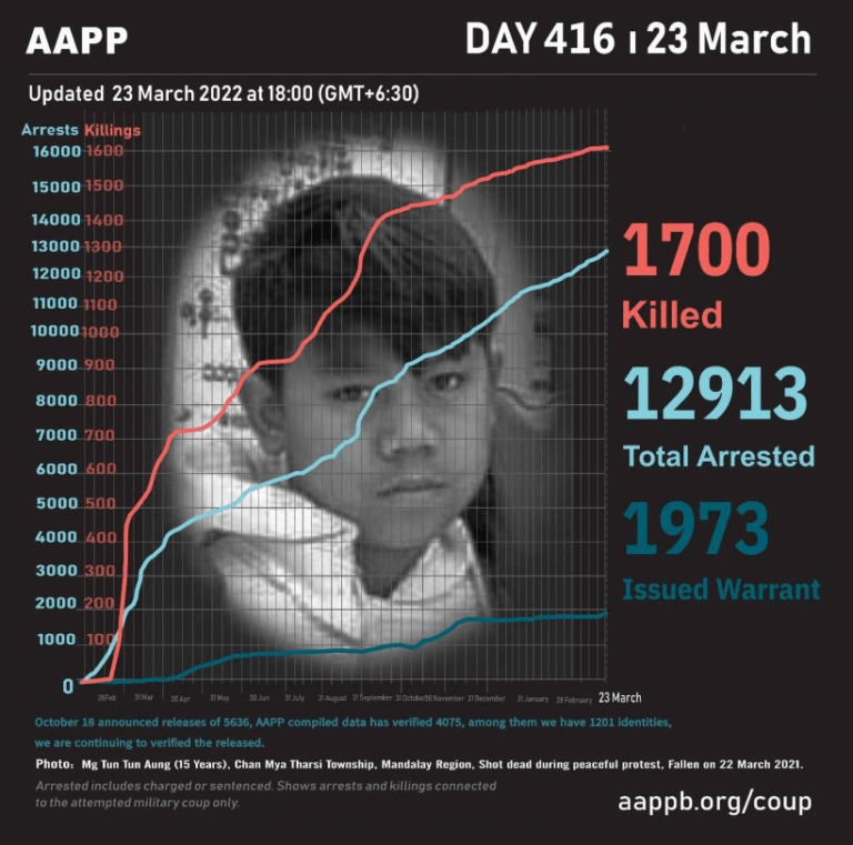 Daily Briefing in Relation to the Military Coup Updated 23 March 2022 According to AAPP documentation, at least (440) houses and buildings have been sealed off by the Junta since the 2021 coup up until February 2022. As of March 23, 2022, (1700) people…