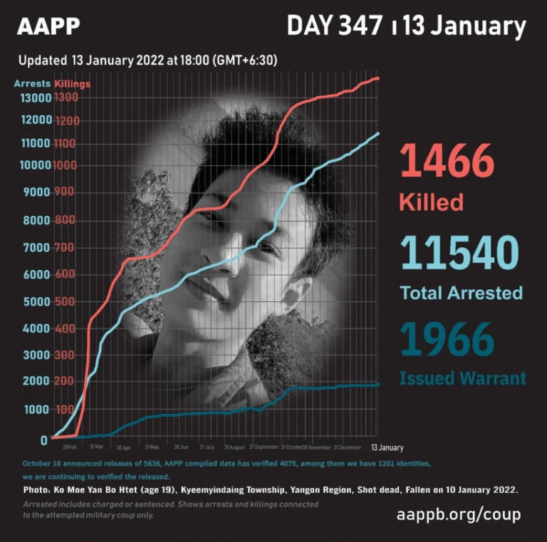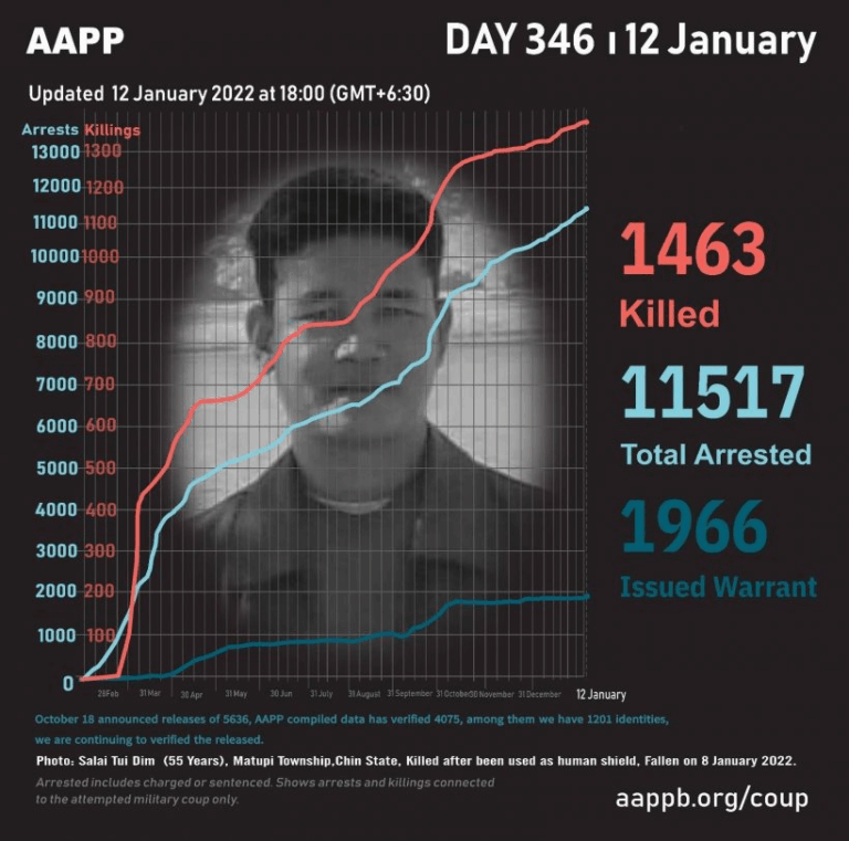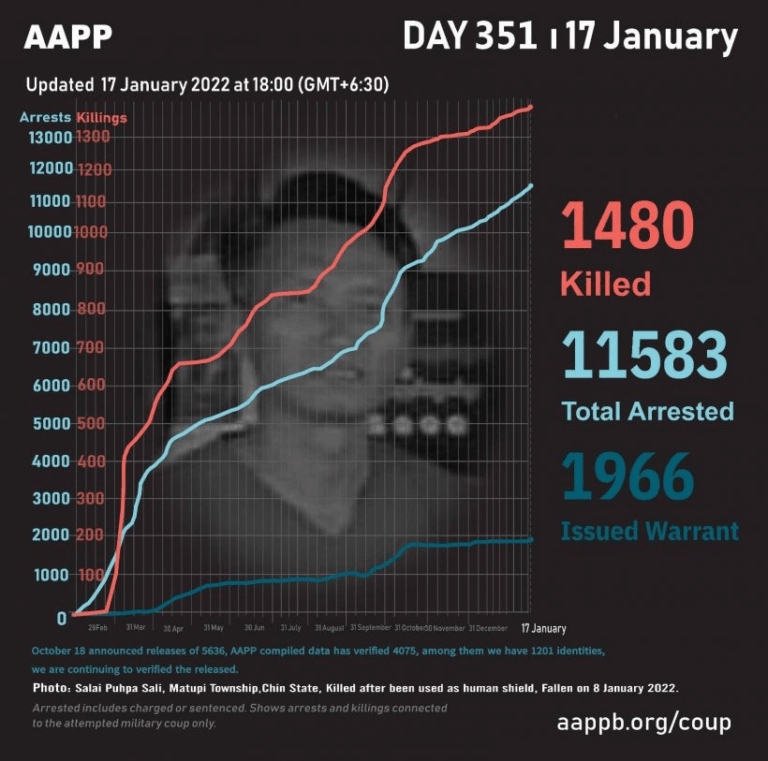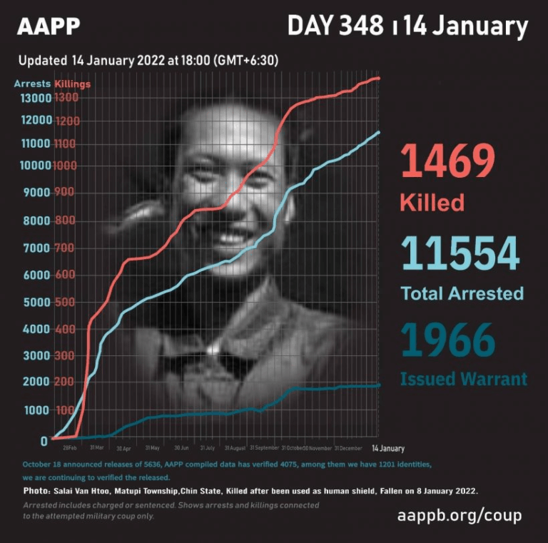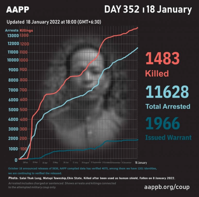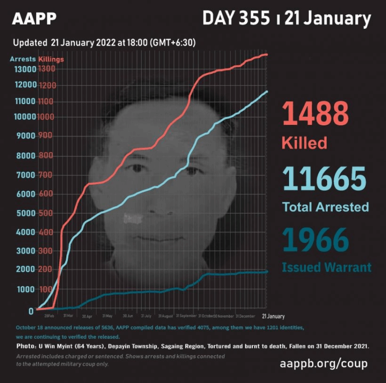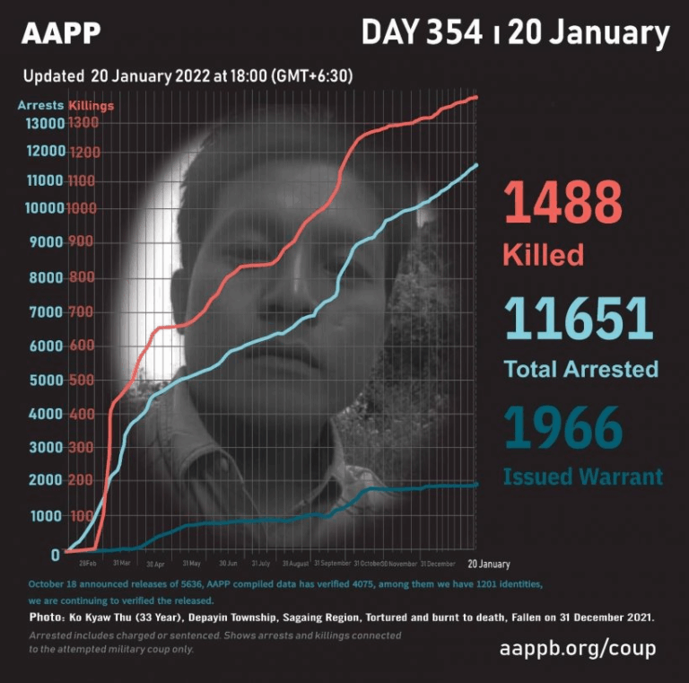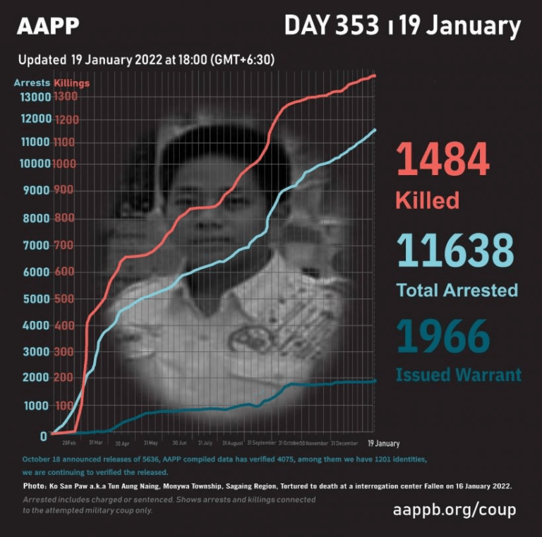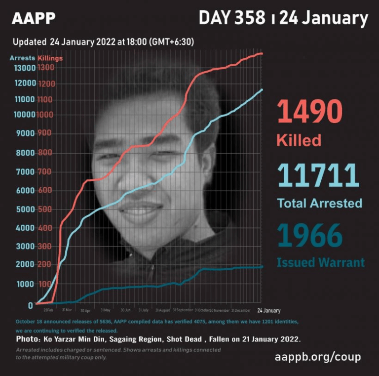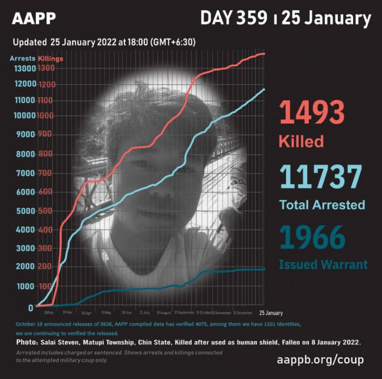 Daily Briefing in Relation to the Military Coup Updated 25 January 2022 As of January 25, (1493) people are now confirmed killed by this junta coup. AAPP compiled and documented (3) fallen heroes today. These (3) fallen heroes from Shwebo…
