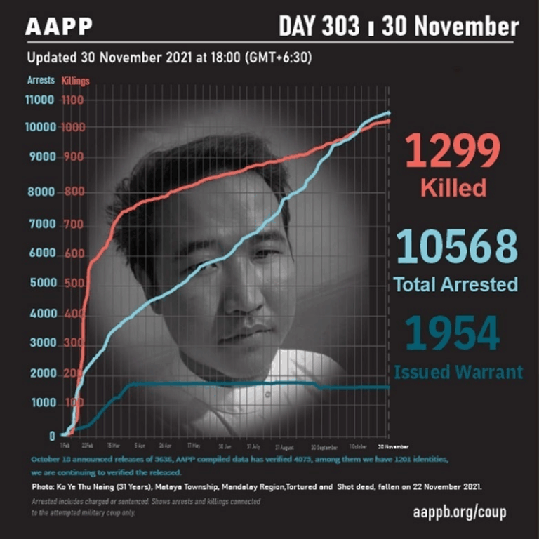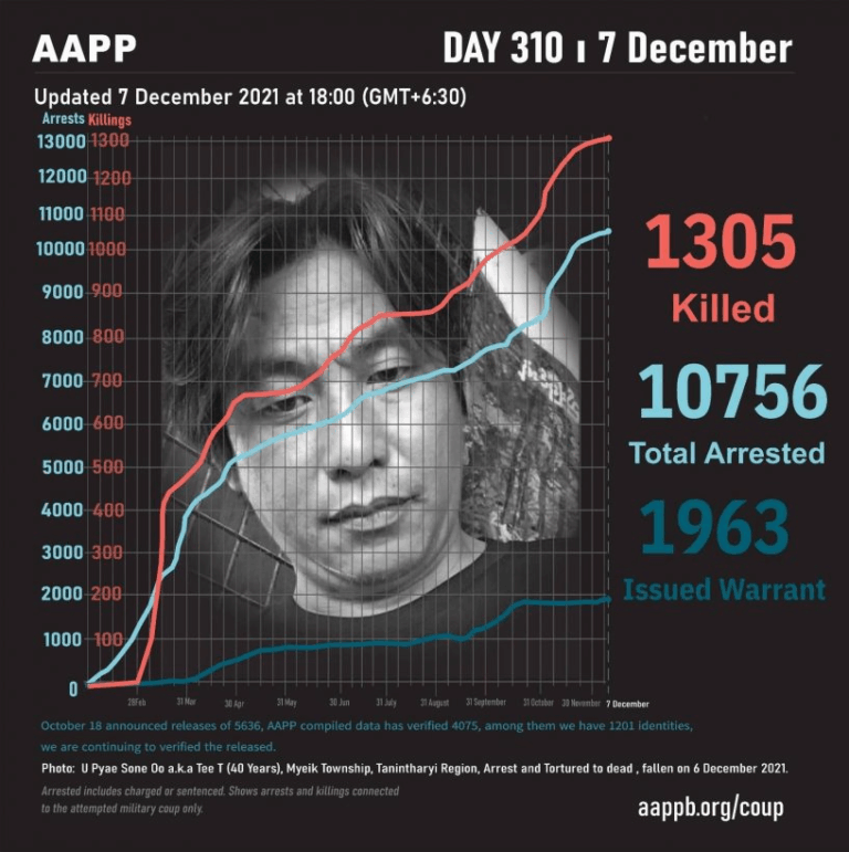 Daily Briefing in Relation to the Military Coup Updated 7 December 2021 As of December 7, (1305) people are now confirmed killed by this junta coup. AAPP compiled and documented (2) fallen heroes today. Thes (2) fallen heroes from Kalay Township in…