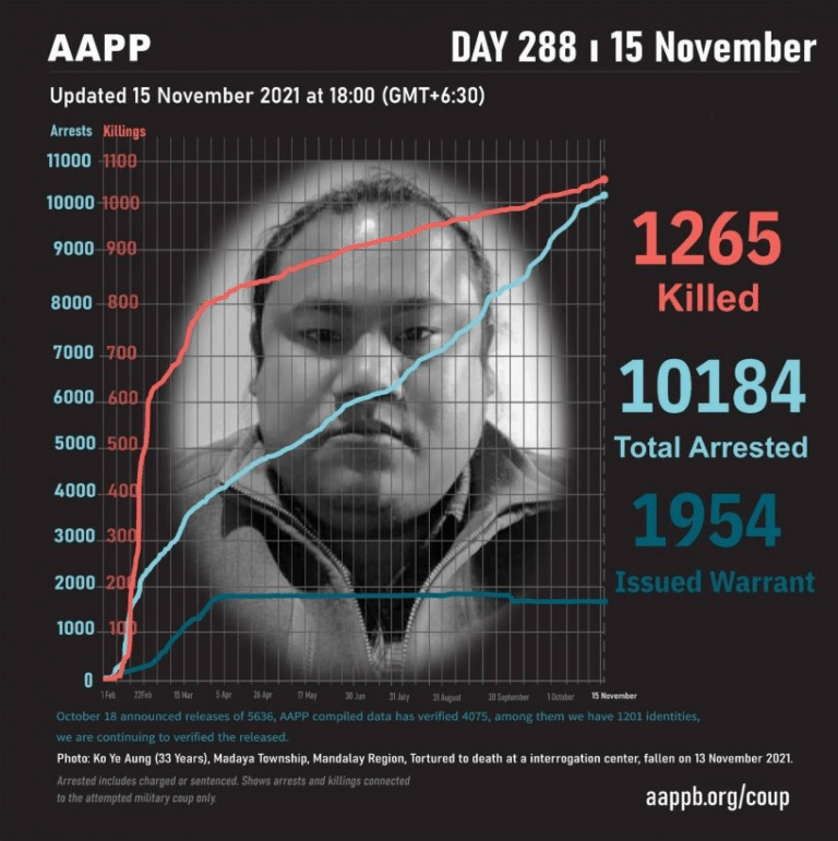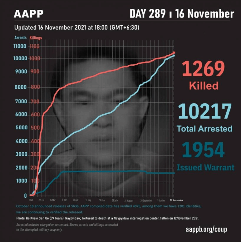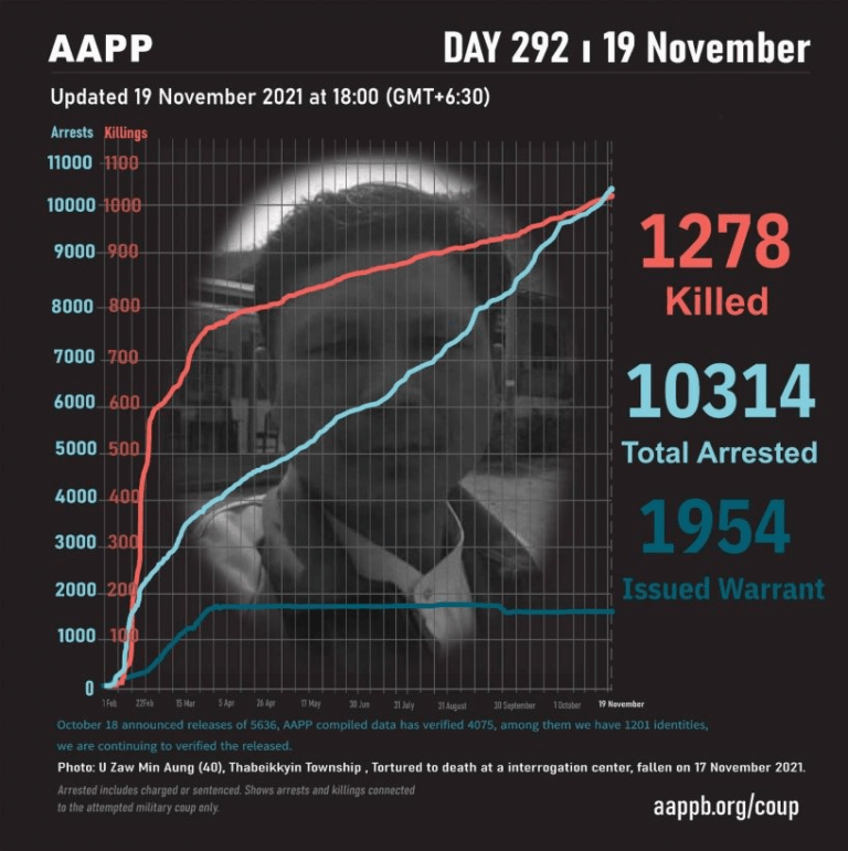 Daily Briefing in Relation to the Military Coup Updated 25 November 2021 As of November 25, (1293) people are now confirmed killed by this junta coup. AAPP compiled and documented (2) fallen heroes today. These (2) fallen heroes from Ayadaw…
