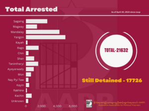 Graphs of arrest and death data as of April 30, 2023 collected and compiled by the Assistance Association for Political Prisoners (AAPP) since the February 1, 2021 military coup.May 1, 2023