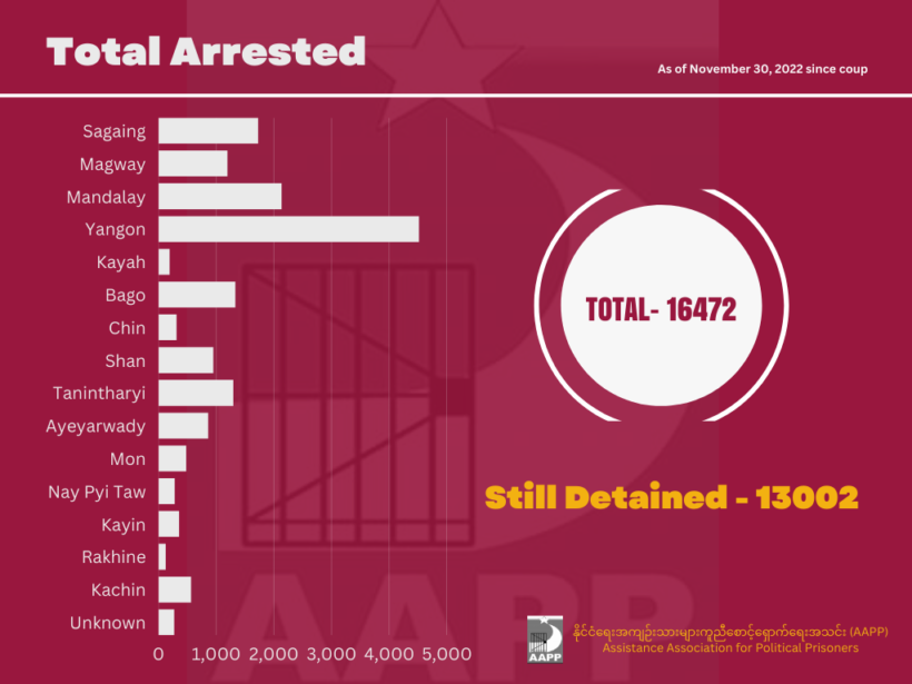 Graphs of arrest and death data as of November 30, 2022 collected and compiled by the Assistance Association for Political Prisoners (AAPP) since the February 1, 2021 military coup.December 1, 2022